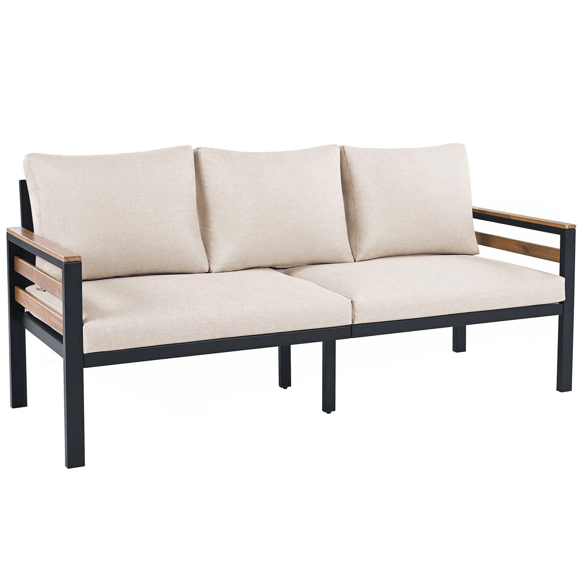 Complete Set Includes: ?1 three-seater sofa (53.96 lbs) 2 armchairs (26.43 lbs each) 1 acacia wood table (18.28 lbs)
