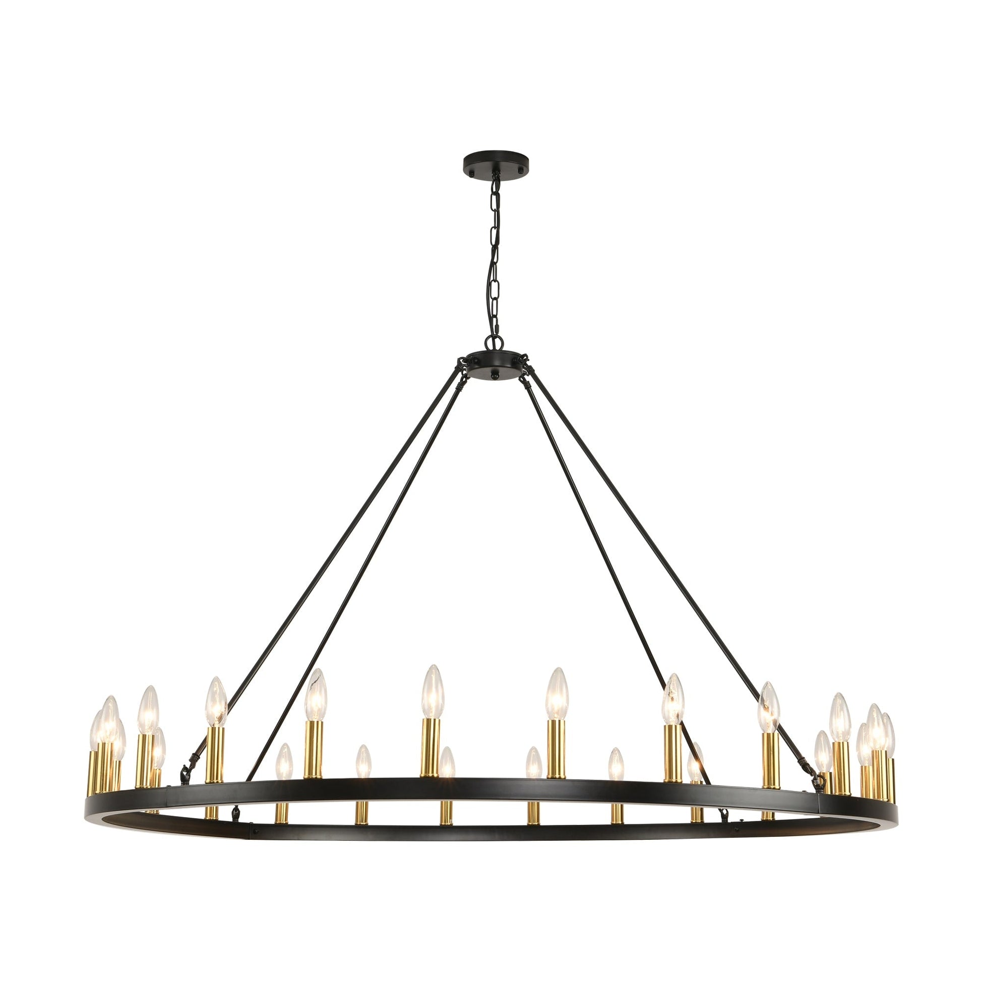 Add a touch of modern farmhouse style to your home 54-inch Round Wagon Wheel 24-light Chandelier. Made of sturdy metal and available in multiple finishes, this chandelier boasts a charming wagon wheel design that is sure to impress. With 24 bulbs and an ample size, this fixture provides plenty of light for larger rooms and is perfect for creating a cozy atmosphere in any space.