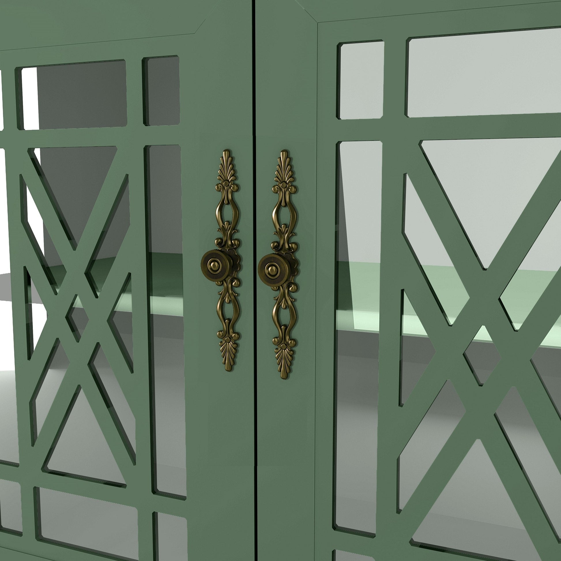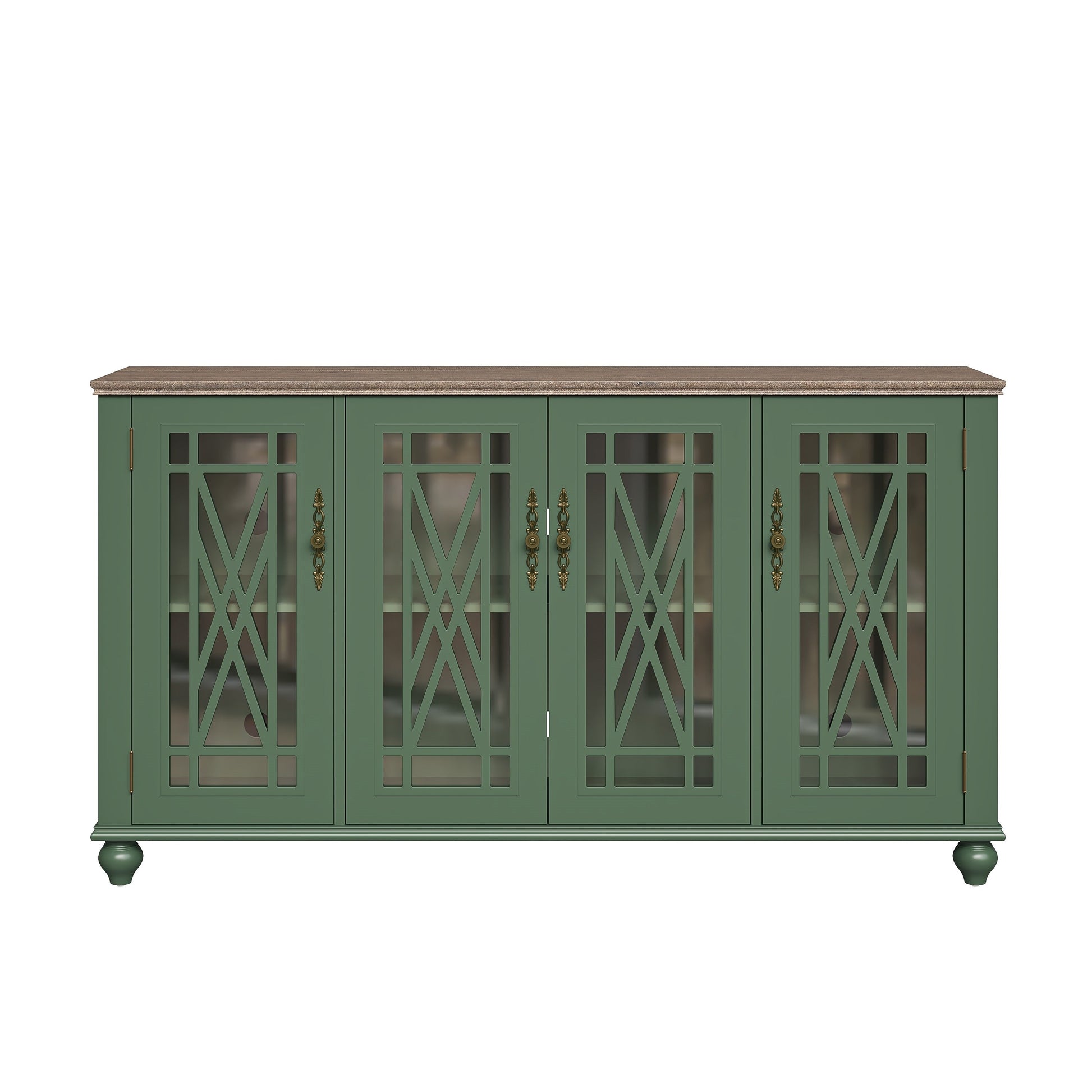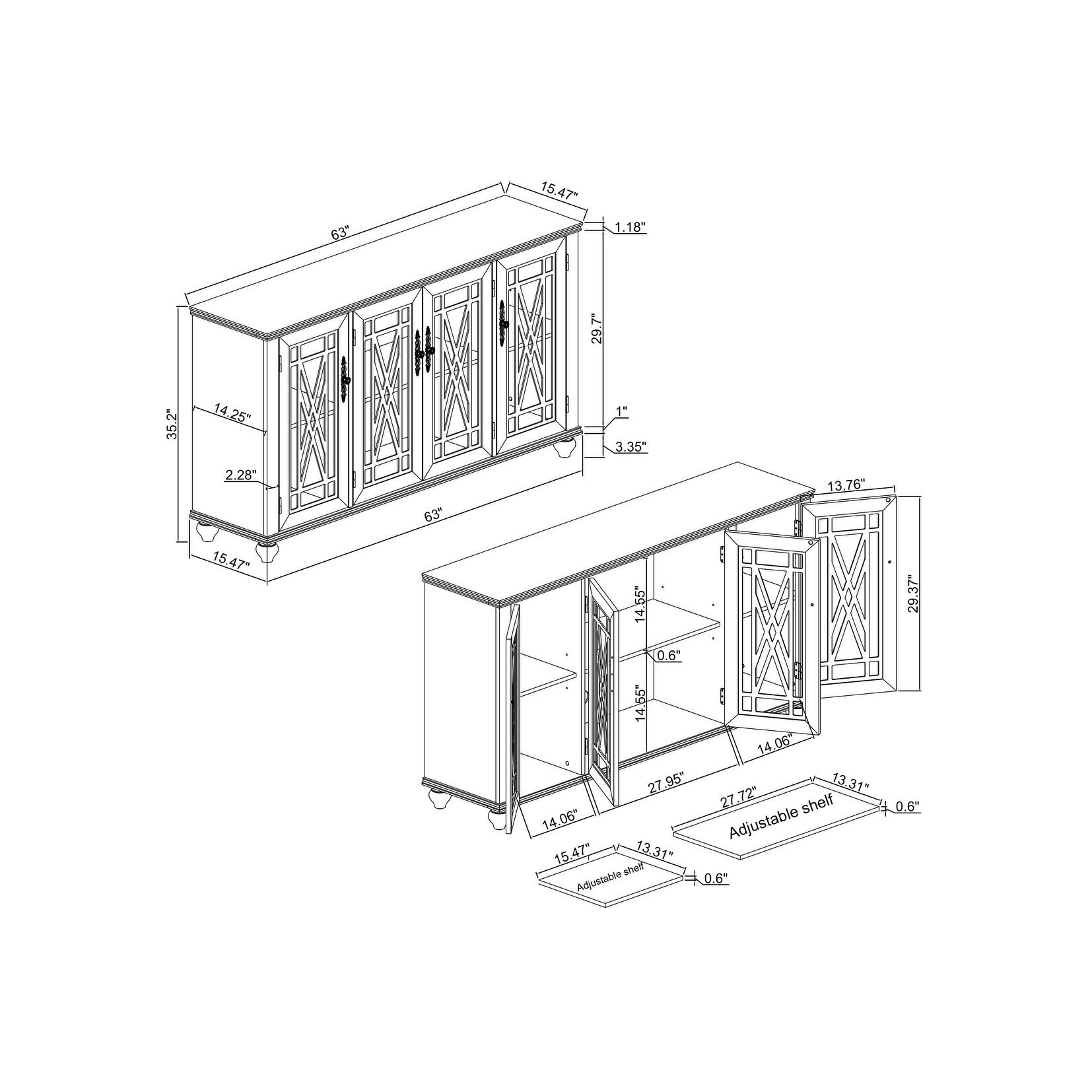 Add a touch of vintage charm to your home with this unique and functional storage cabinet. Made with solid wood and high-grade MDF for long-lasting construction, this cabinet features four glass paneled doors with an intricate wood overlay, and vintage-style metal pulls. With adjustable shelves, this cabinet offers ample storage space that can be customized to fit your needs. Use it as a sideboard in the kitchen or dining room, a console in the living room, or an entryway storage solution. The quick-install hinges make assembly easy and hassle-free..