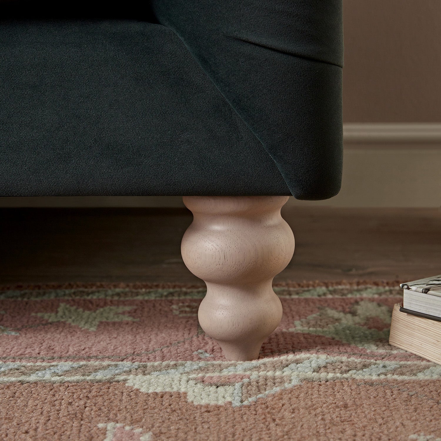 - Slightly distressed turned solid wood legs complement the beautiful neural appeal of the sofa.