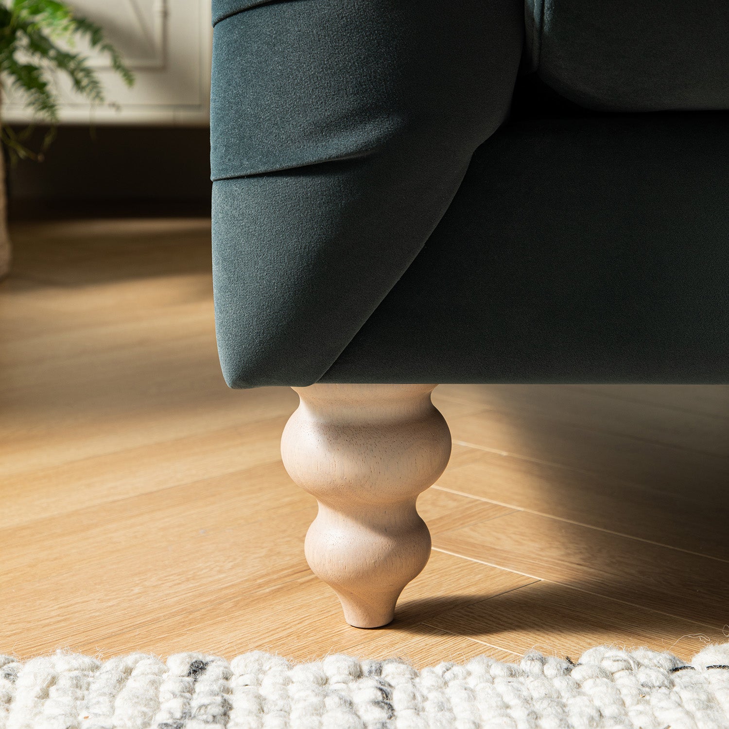 - Slightly distressed turned solid wood legs complement the beautiful neural appeal of the sofa.
