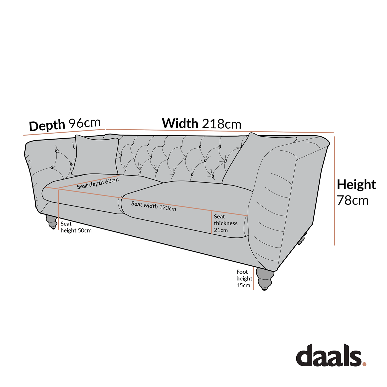 - Three seater sofa size: W 218 x D 96 x H 78 cm.