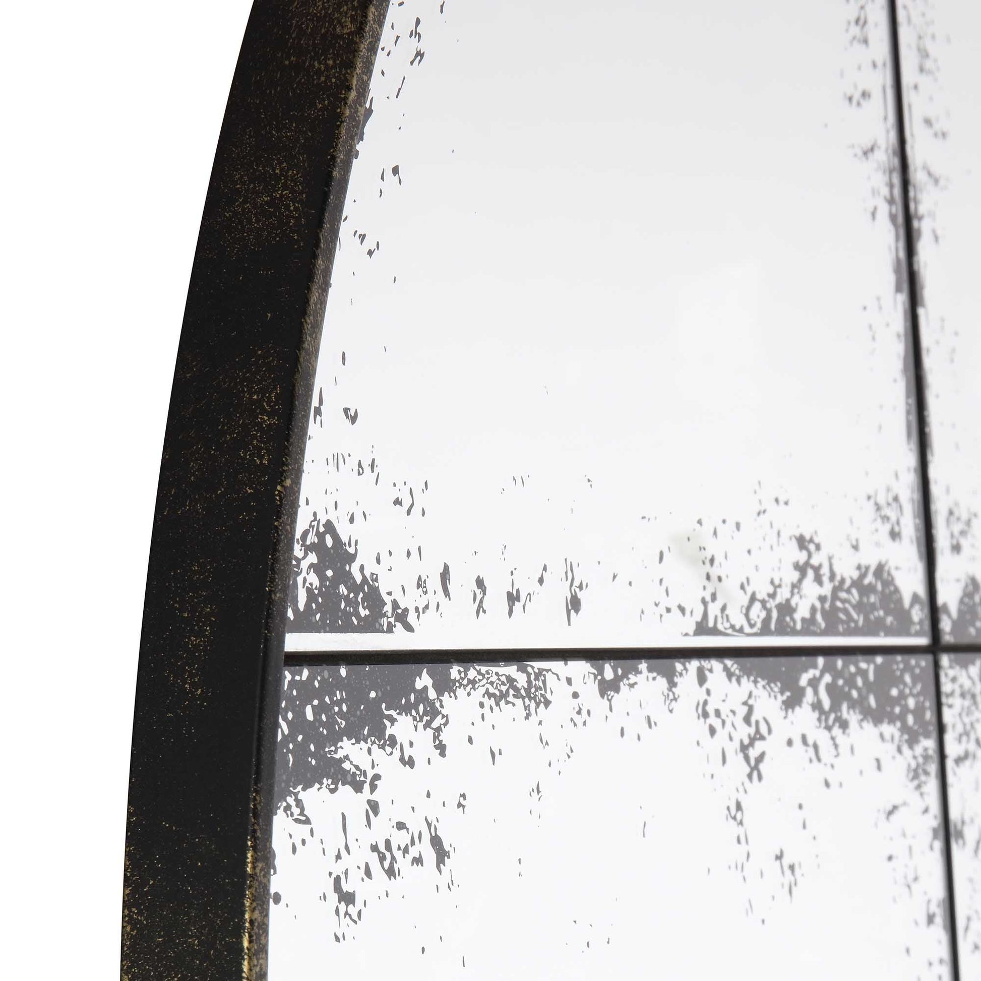 - The mirror is made from antiqued mirror glass with small black dots and framed with distressed black/bronze metal edge.
