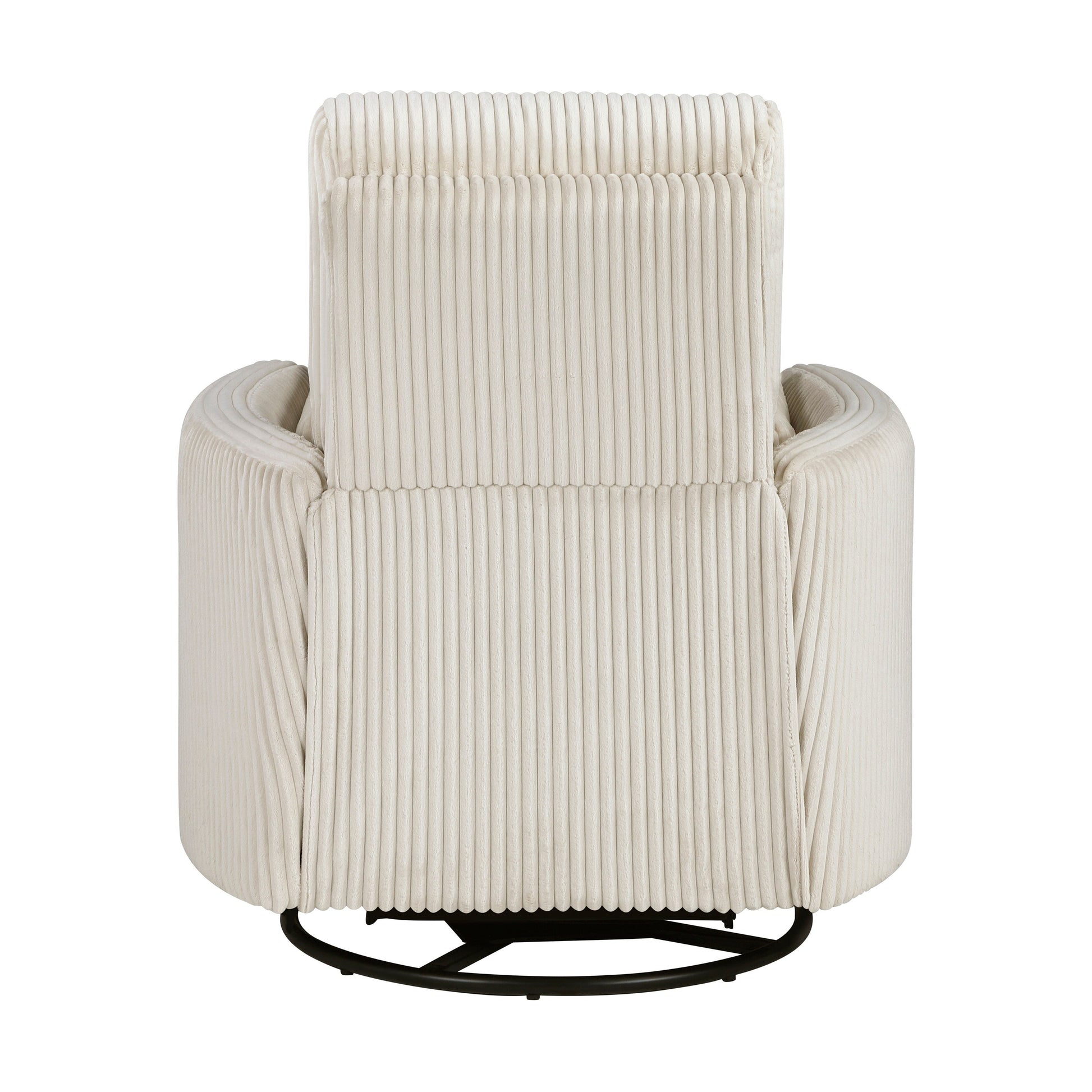 Unwind in style with this swivel recliner, elegantly upholstered in luxurious corduroy fabric. Designed for lasting comfort, it features attached back and seat cushions and a convenient pull-handle reclining mechanism for effortless relaxation. Enjoy the versatility of a 360-degree swivel and a gentle gliding motion. Two matching pillows are included, adding both comfort and visual charm to your space. This collection offered in beige, gray and taupe colors.