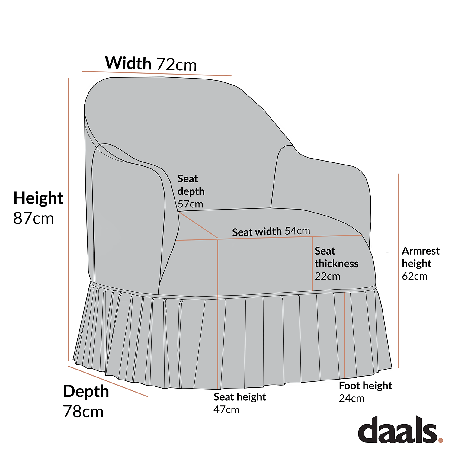 - Designed with beautiful sloped arms and skirted bottom, the compact sized armchair is ideal for room corners, dressing rooms, bathrooms or as additional dining seat.