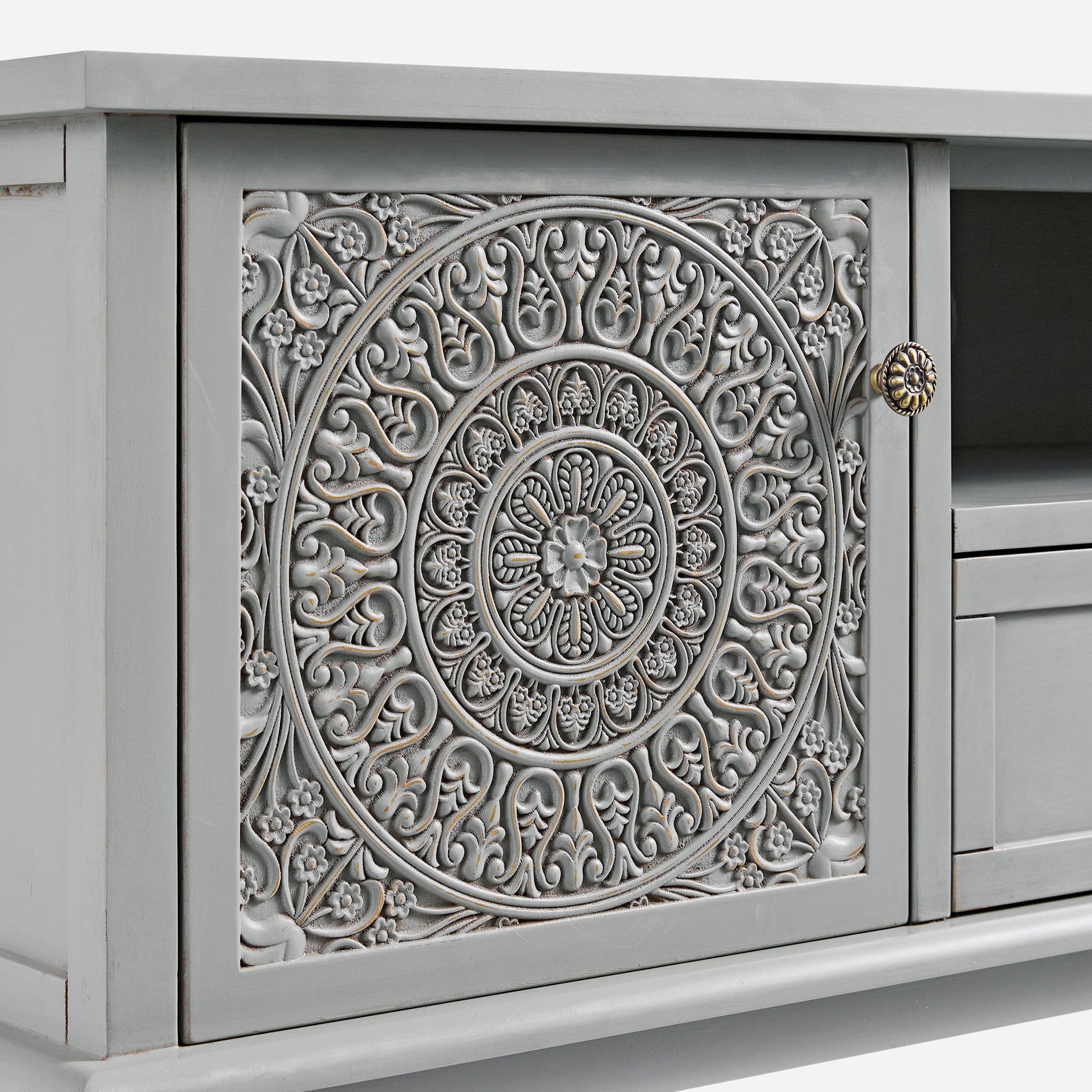 - Flanking the centre drawer are two carved doors, each showcasing mandala-inspired carved panels that add texture and character without overwhelming.