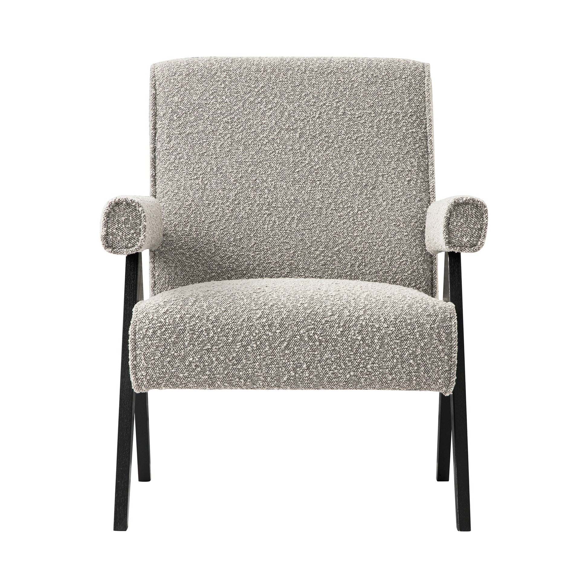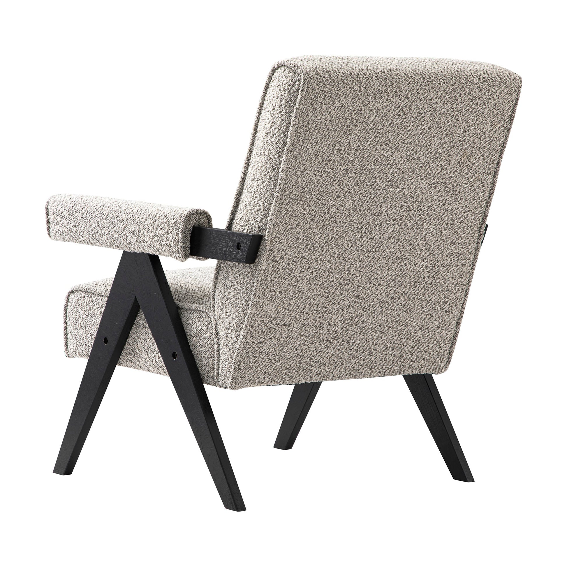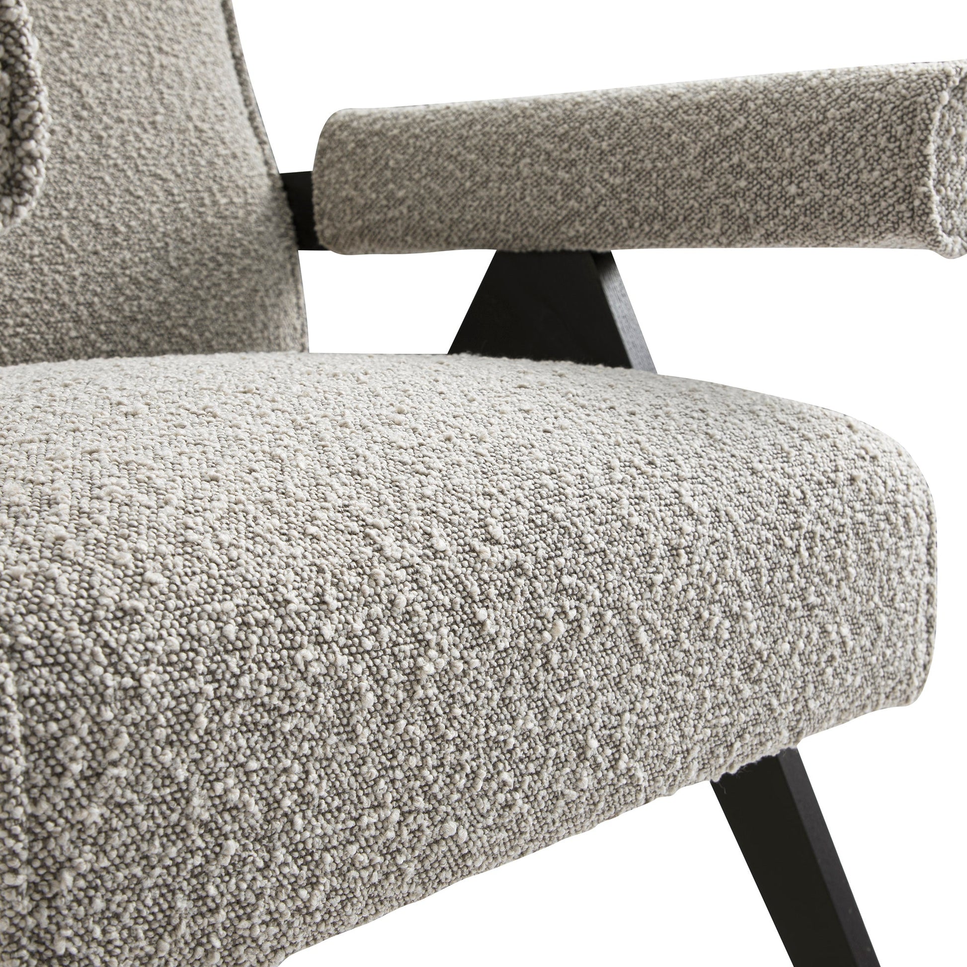 - Well-cushioned in seat, back and arm and upholstered in beautiful textured taupe colour boucle fabric, the chair is finished with solid oak legs painted with matte black for a mid-century appeal.