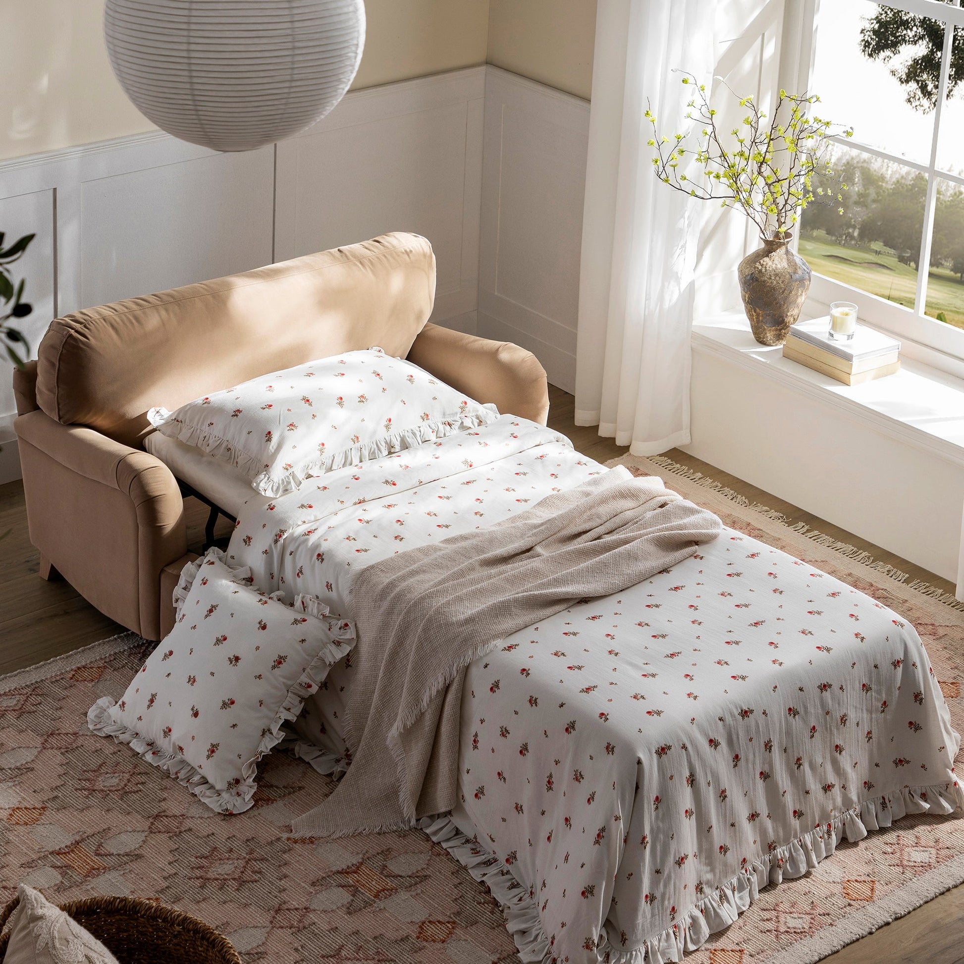 - Complete the look: Pictured with the Daphnis Camel Velvet Sofa Bed, Loveseat, is our Yasmin Kilim Pink Handwoven Wool & Jute Rug and our Darcy Rose Ivory White Ruffle Linen Blend Duvet Set
