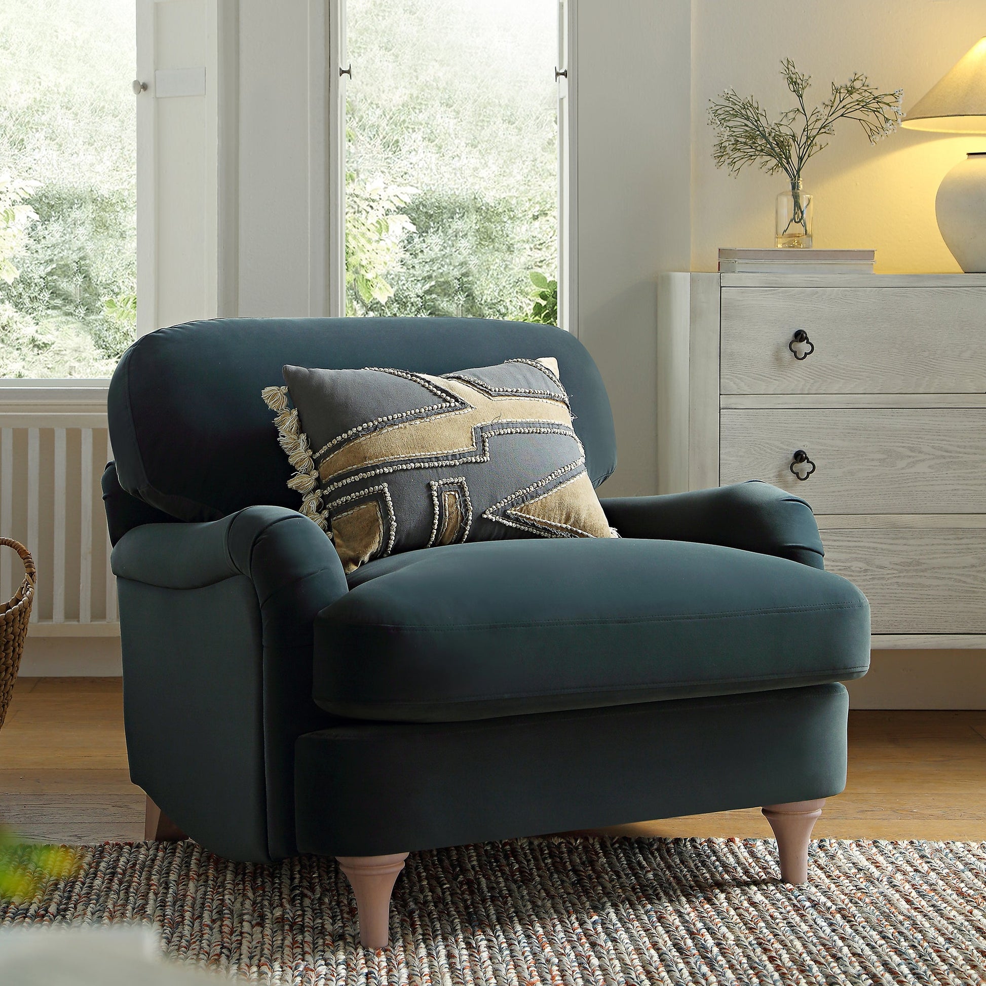 - Complete the look: Pictured with our Daphnis Aegean Blue Velvet 1-Seater Sofa is our Thalia Concave Chest of 3 Drawers in Washed White and our Aurora Teal and Bronze Hand Braided Jute Rug