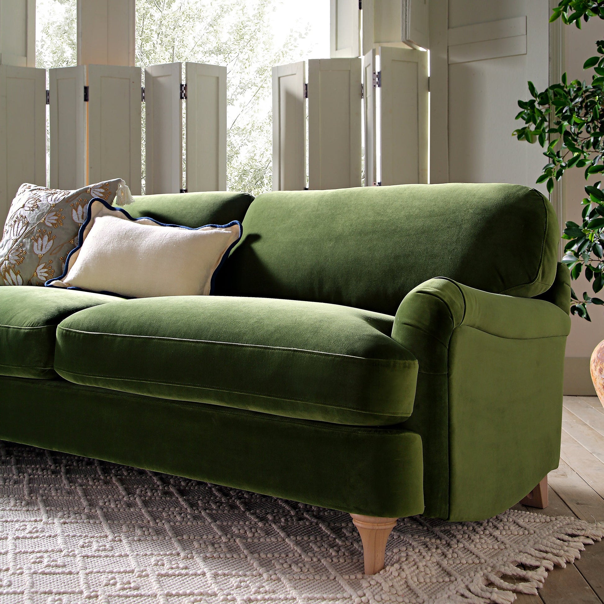 - Complete the look: Pictured with our Daphnis Fern Green Velvet 3-Seater Sofa is our Avanti Handwoven Cream Bobble Wool Rug, our Evie Linen Prussian Blue Rectangular Cushion and our Vine Collection Wild Lotus Hand Embroidered Cushion