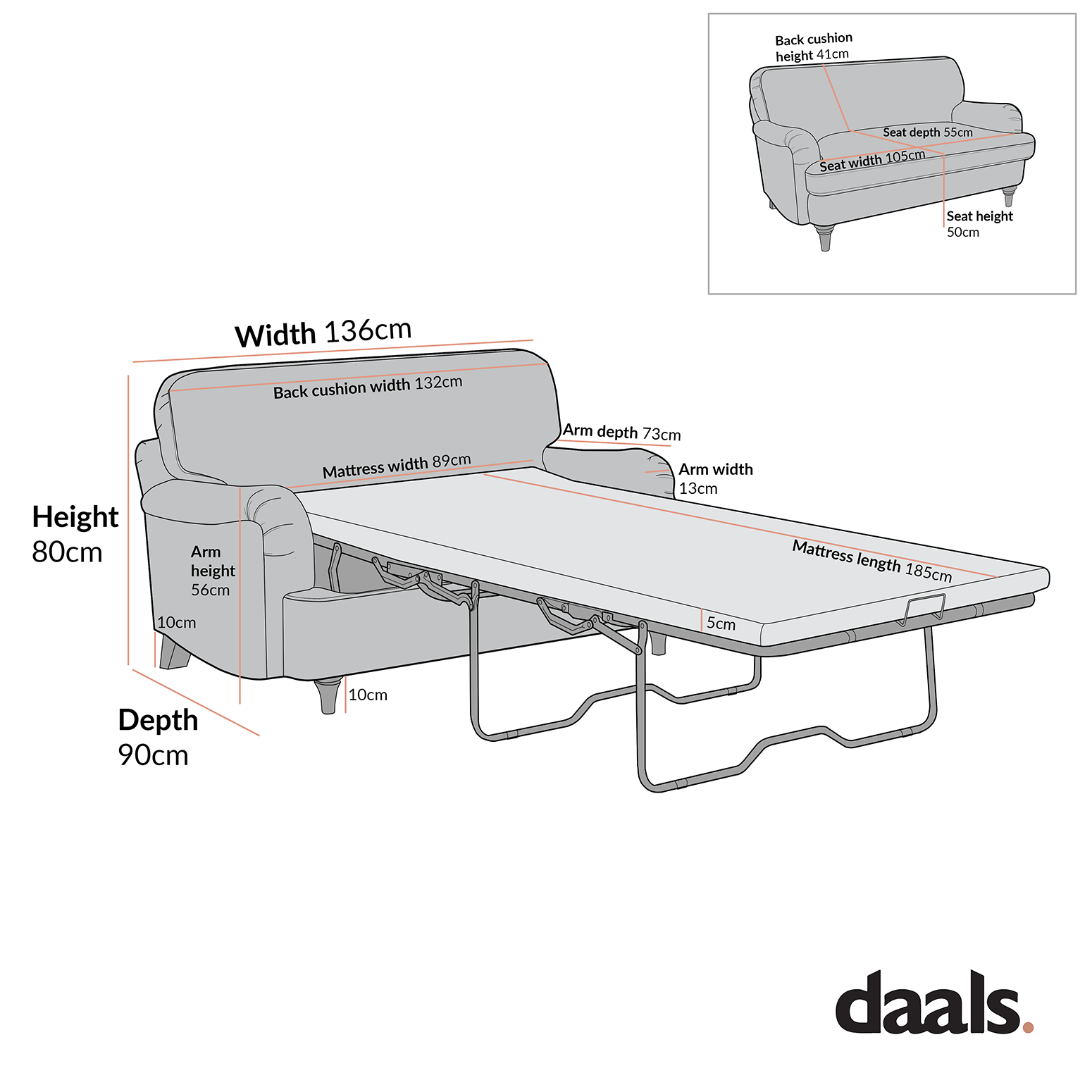 - Loveseat (1.5 Seater) sofa bed size: W 136 x D 90 x H 80 cm.