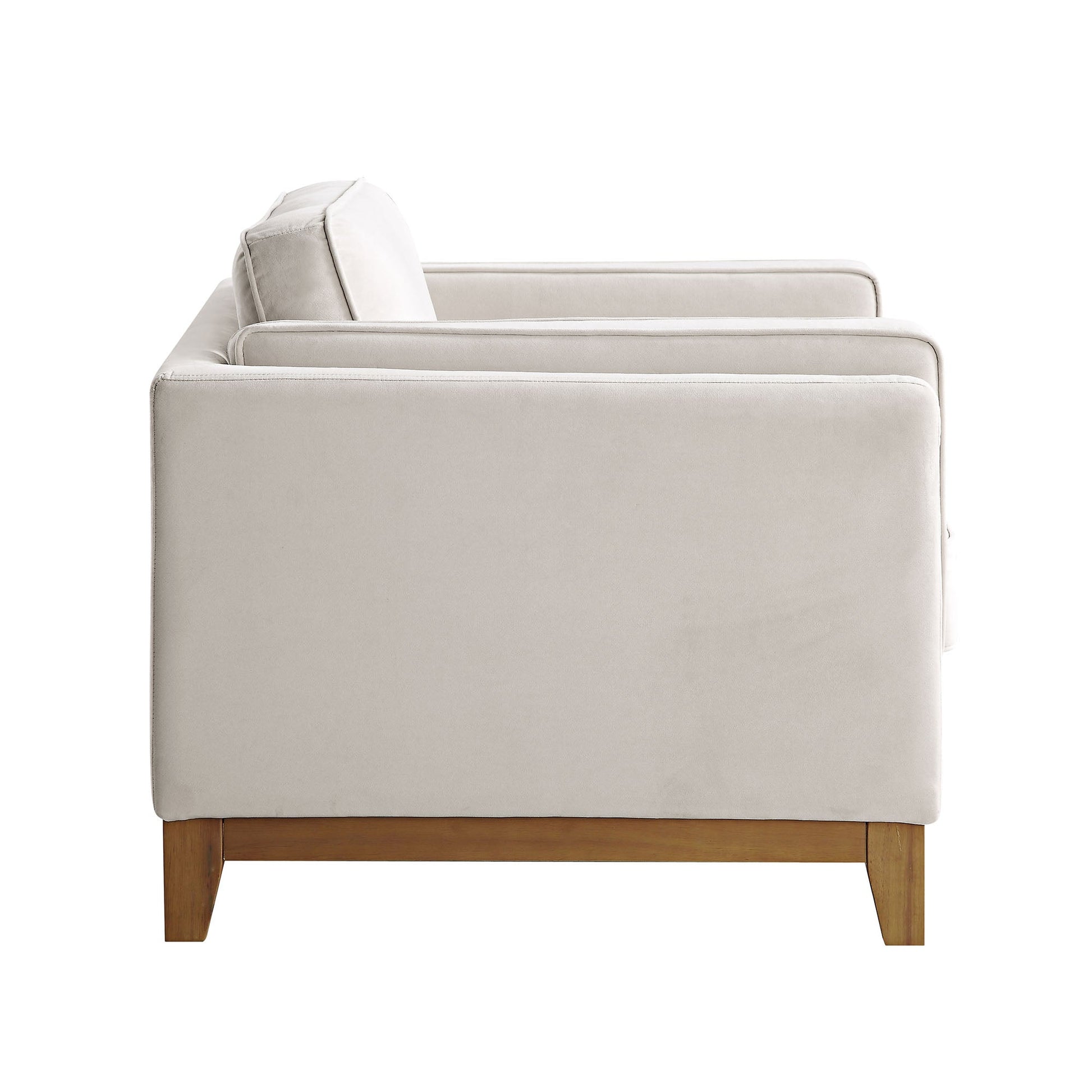 - Designed with track armrests and solid wood base, the sofa features seat cushions composed of springs and foam for a comfortable lounge place.