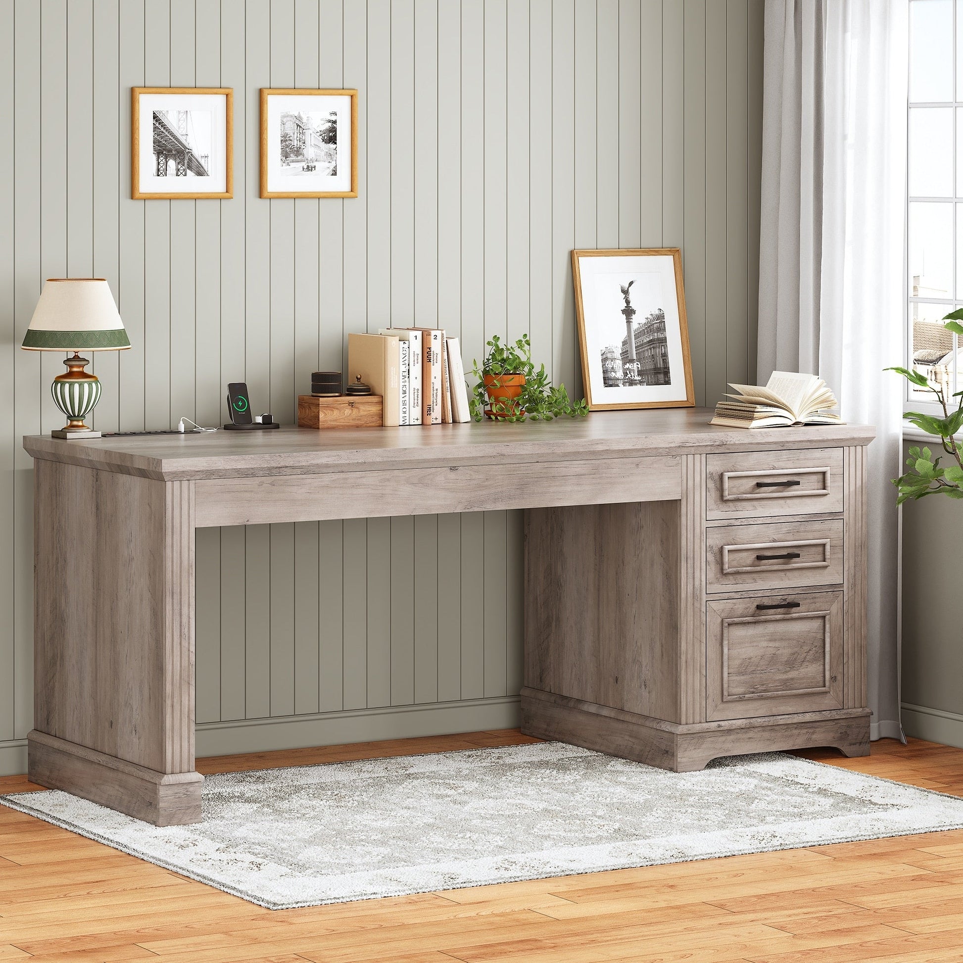 Farmhouse Executive Desk Home Office Desk File Drawer Monitor Stand Power Outlet
