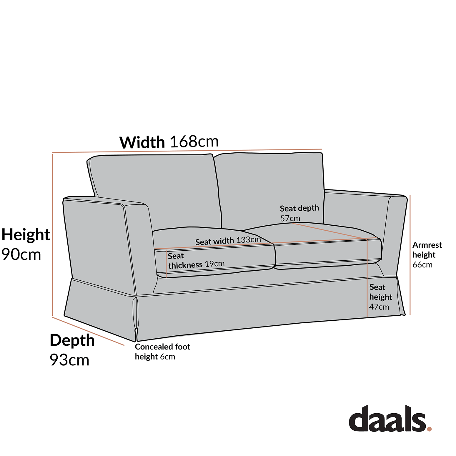 - Two seater sofa size: W 168 x D 93 x H 90 cm.
