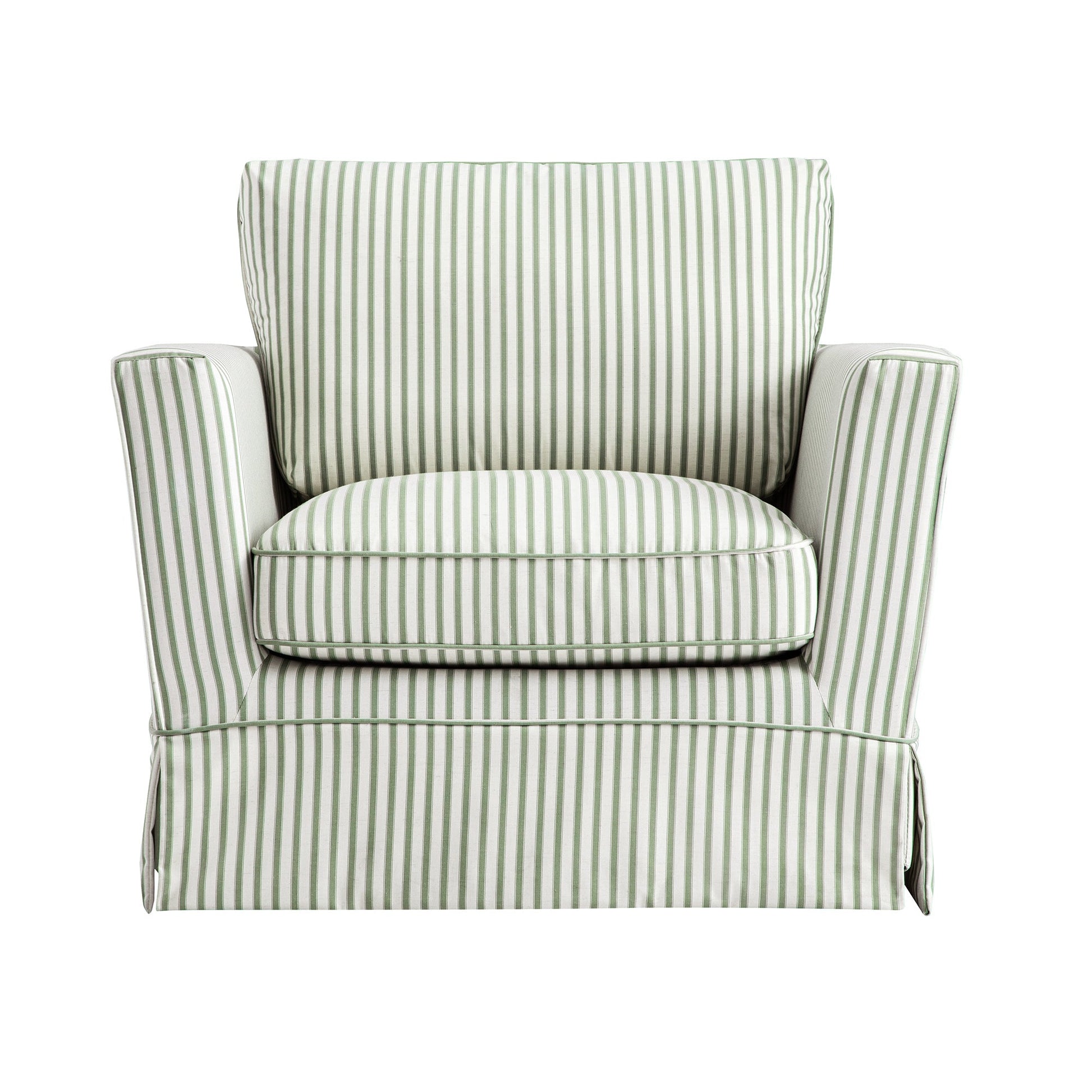 - A fresh interpretation of timeless comfort, the Fitz Skirted Armchair in sage stripe brings a refined yet inviting presence to any room.
