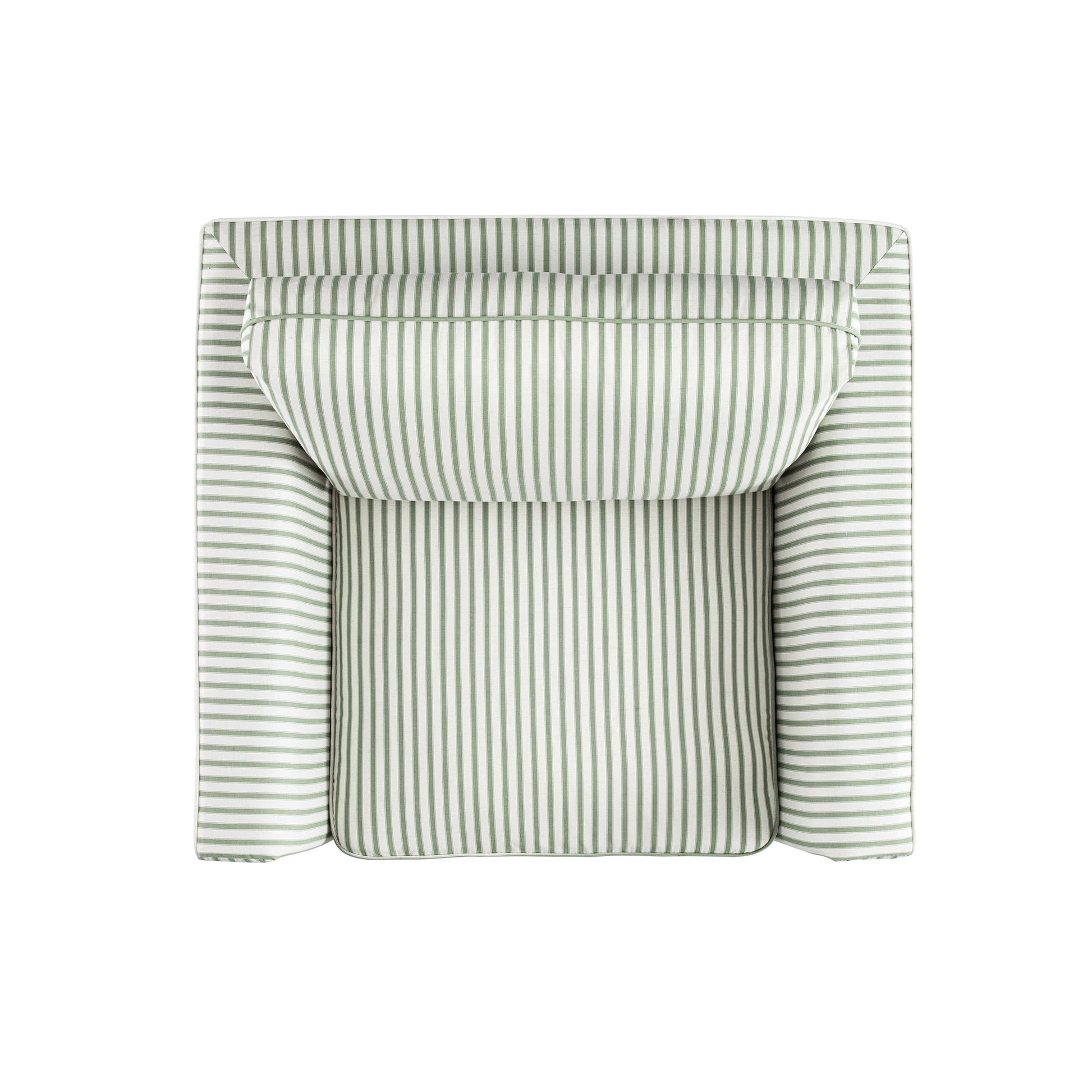 - Upholstered in a soft linen-blend fabric, its sage green and ivory ticking stripes evoke a gentle, countryside charm—subtle enough to feel serene, yet distinct enough to make a quiet statement.