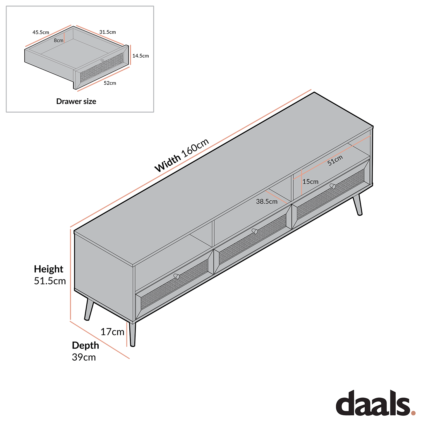 - Complete the look: Pictured with our Frances Woven Rattan 160cm 3-Drawer TV Unit is our Evie Hand Braided Scalloped Jute Rug