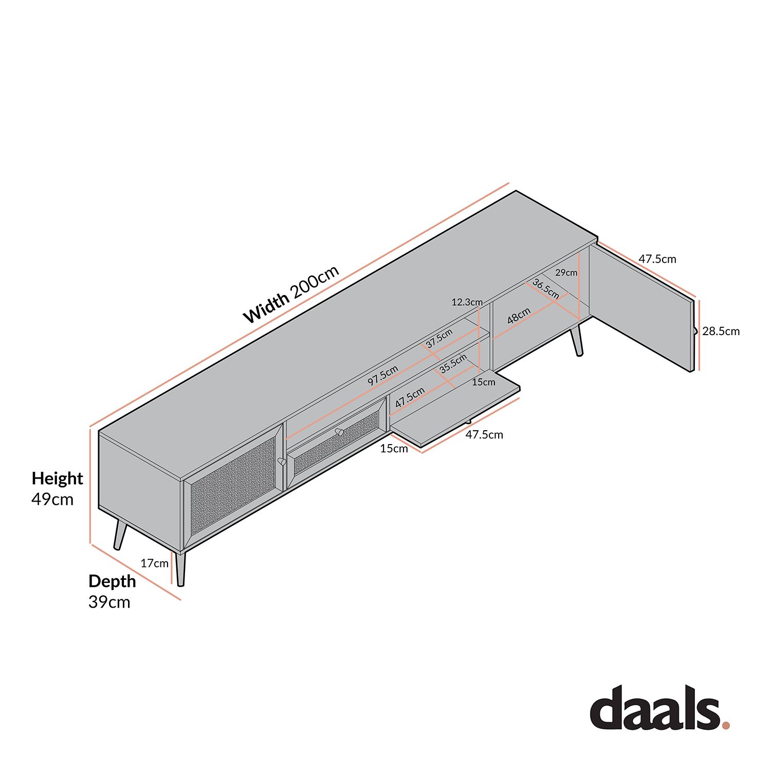 - Complete the look: Pictured with our Frances Woven Rattan 200cm Wide TV Unit is our Hansel Upholstered Moss Green and Walnut Chair and our Aurora Hand Braided Teal and Bronze Jute Rug