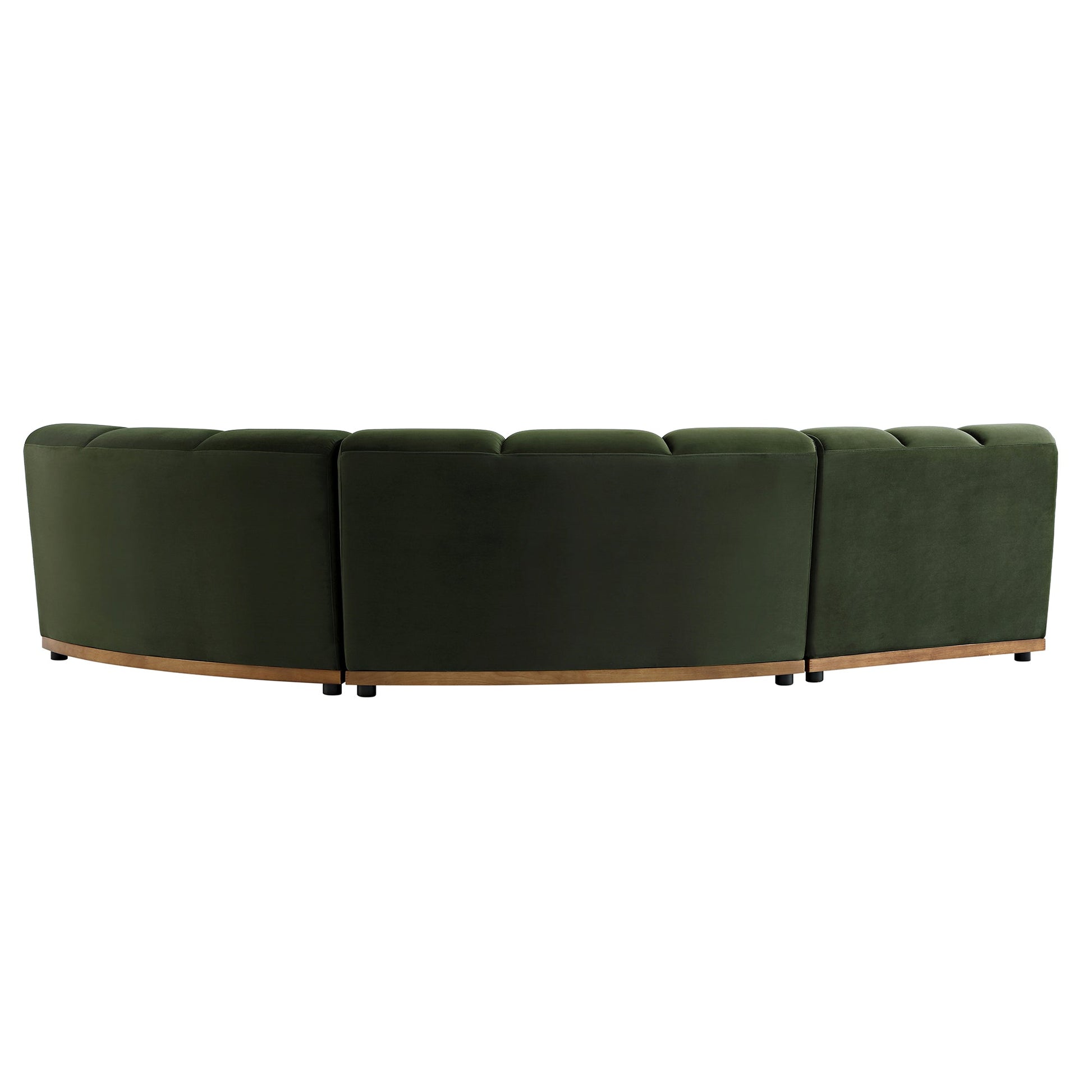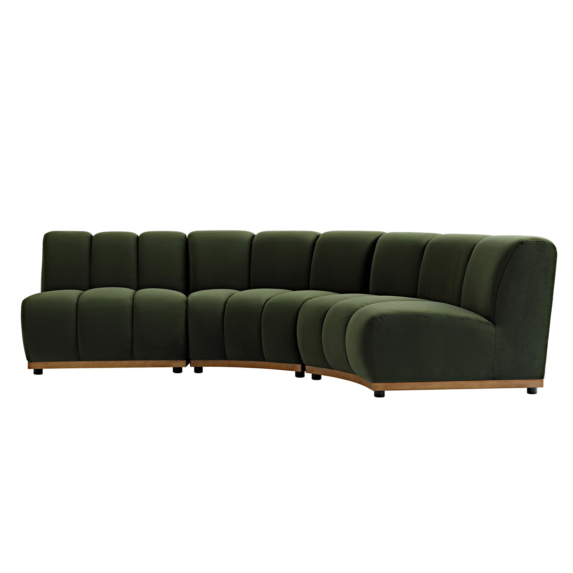 - Upholstered with earthy moss green velvet fabric, the sofa modules are mounted on light walnut colour stained solid wood bases.