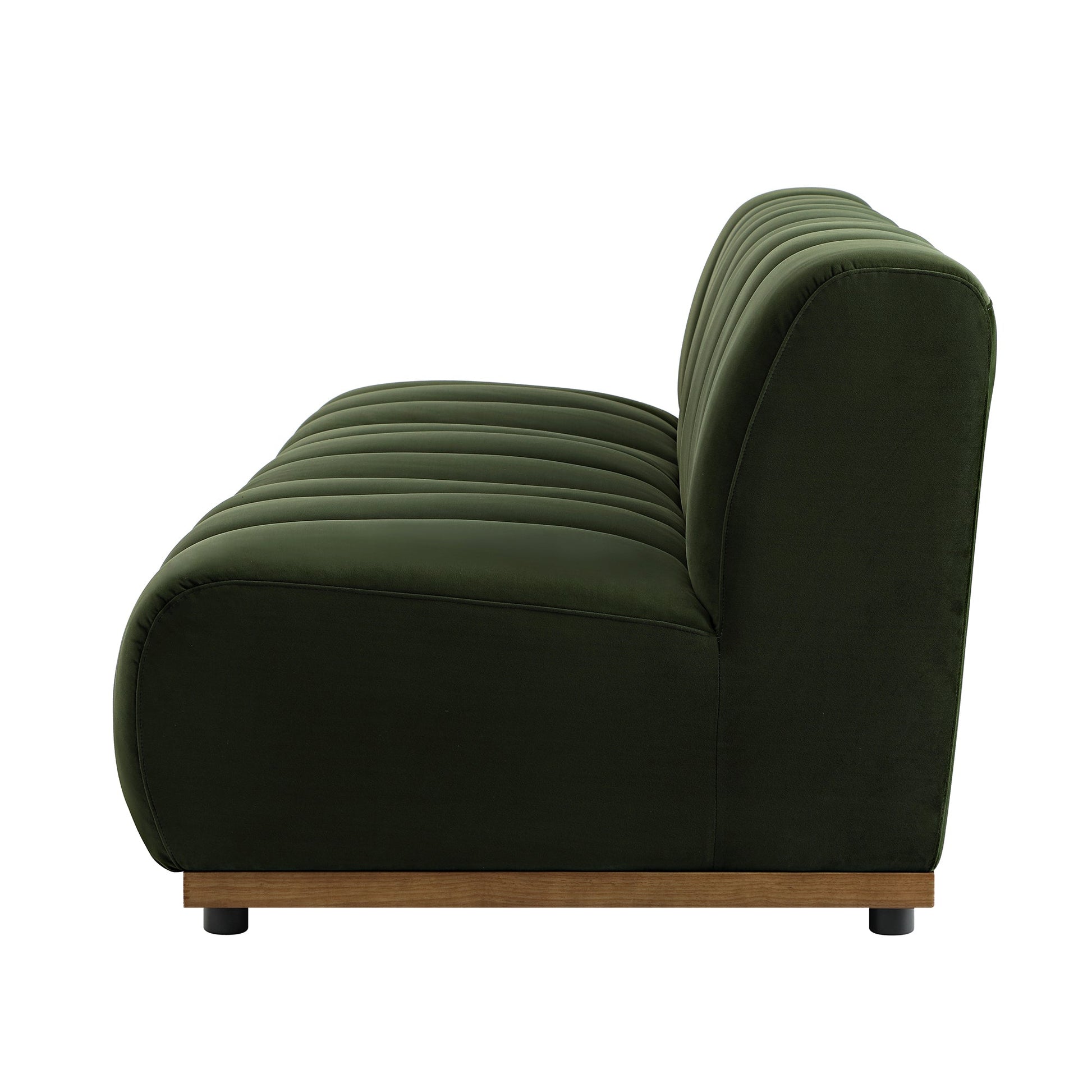- Upholstered with earthy moss green velvet fabric, the sofa modules are mounted on light walnut colour stained solid wood bases.