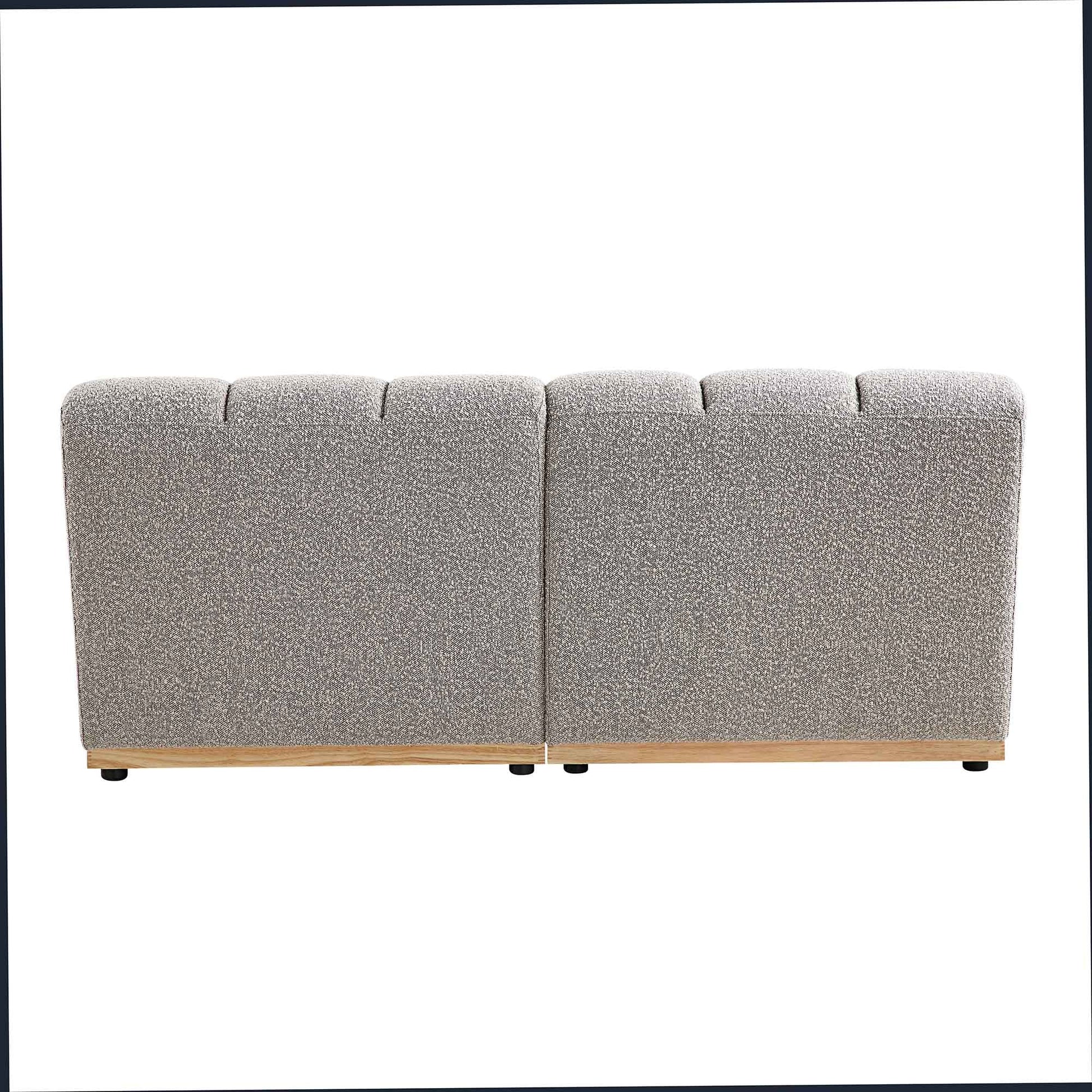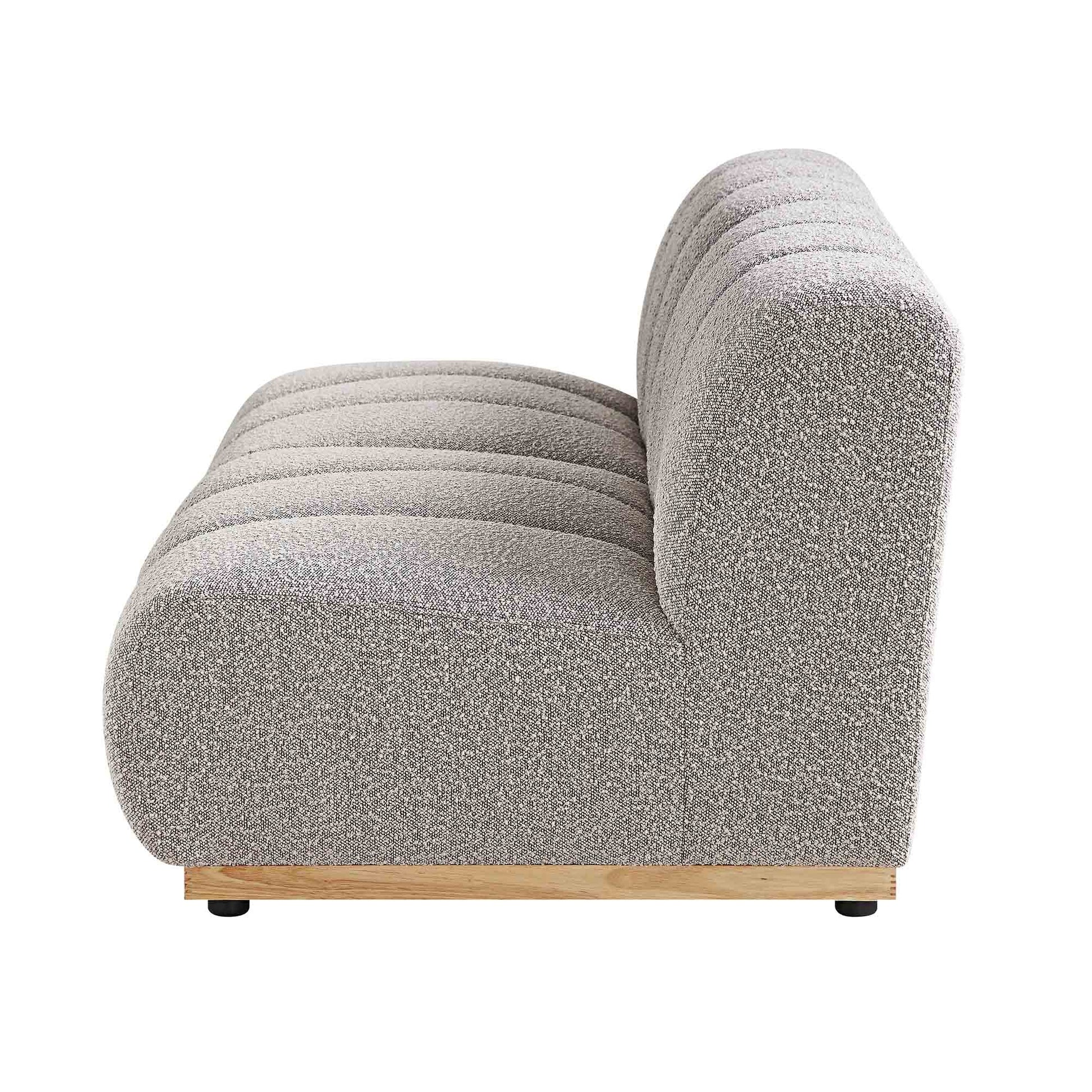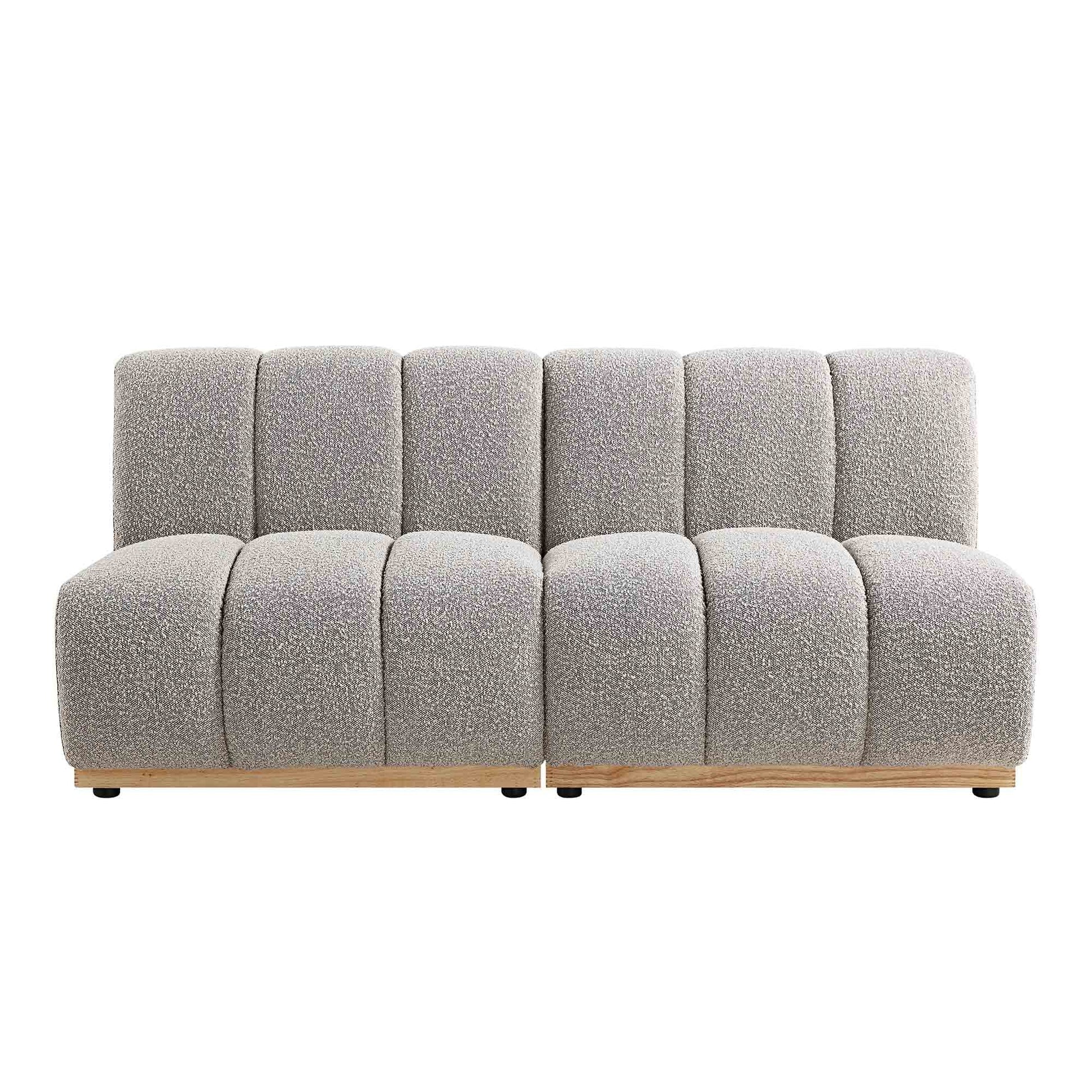- Upholstered with beautiful taupe boucle fabric, the sofa modules are mounted on natural solid wood bases.