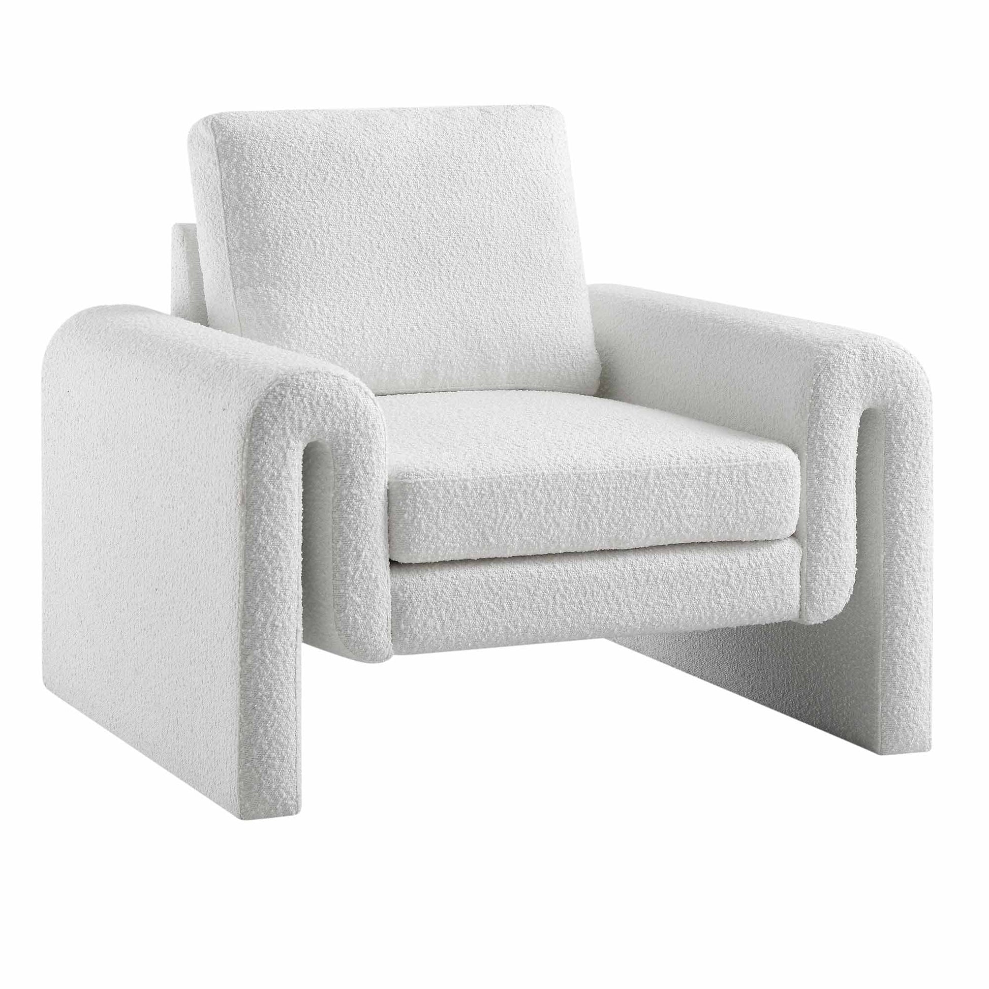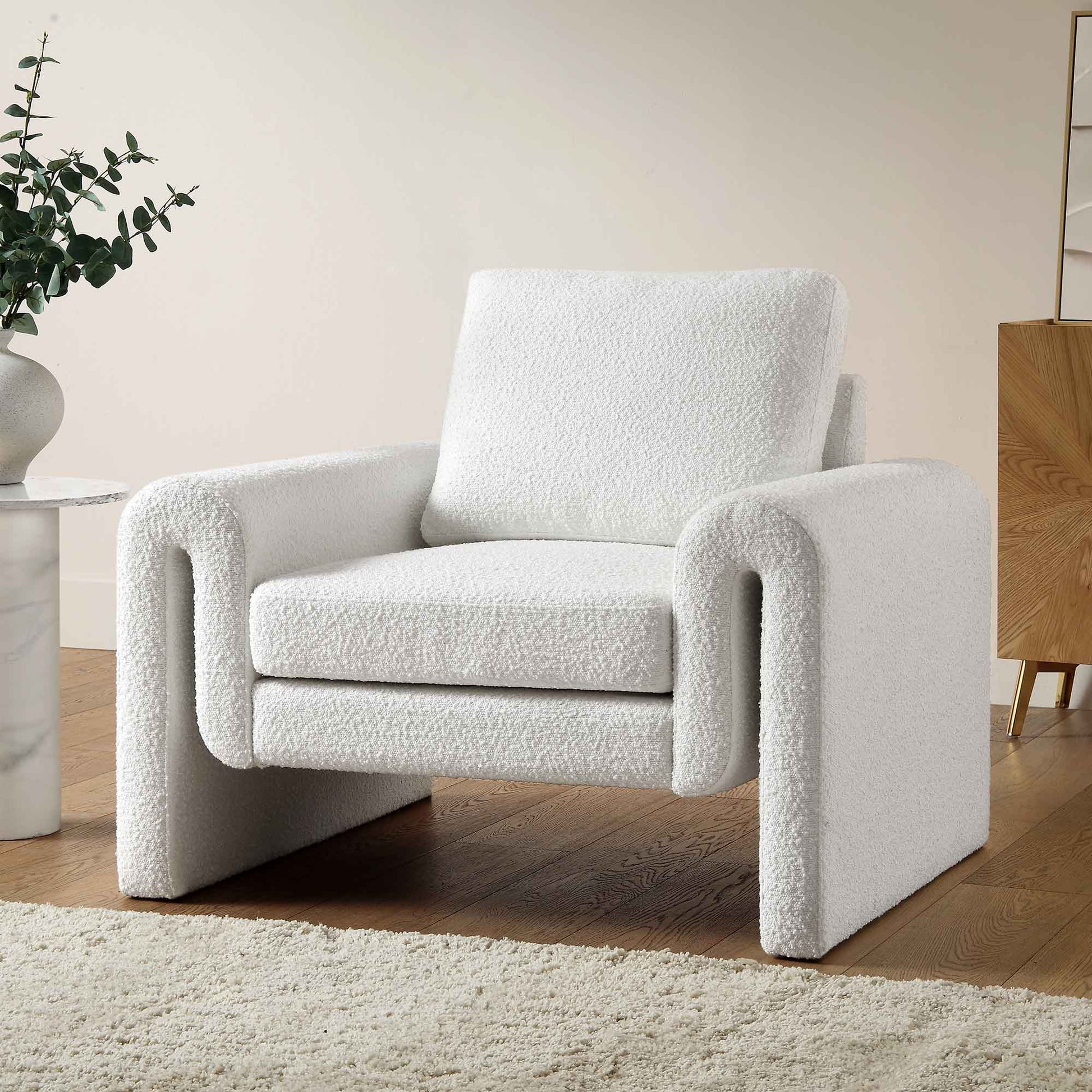 - Complete the look: Pictured with our stylish Hampstead White Boucle Curved Armchair is our stunning Bohdi Oak 160cm Wide Sideboard.