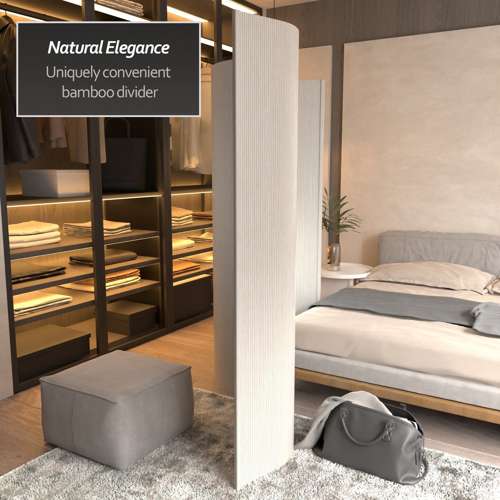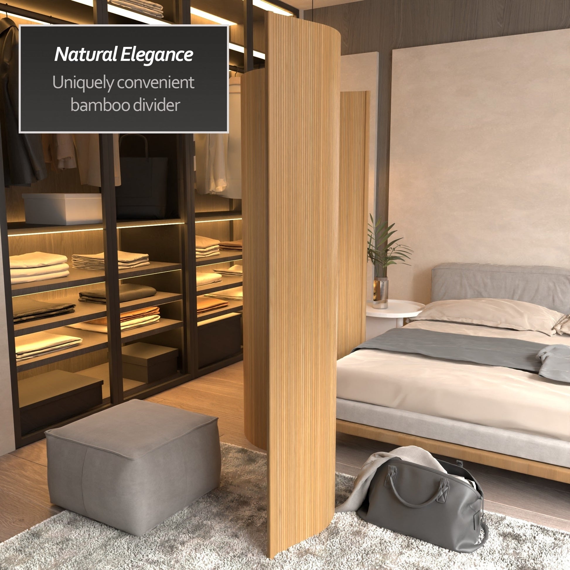 This full-sized room divider partition or space separator combines vintage midcentury modern design with contemporary aesthetics and convenience for an elegant way to divide a space or hide visual vlutter. Crafted from kiln dried lacquered bamboo slats in an interlocking wave design, easy to bend for multiple purposes, then rolls right up for easy storage when not in use. The tropical, bamboo decor adds a natural, earthy element to both home or professional work spaces. Offered in your choice of natural or stained finishes. Ready to use out of the box, no assembly required, clean with damp cloth.