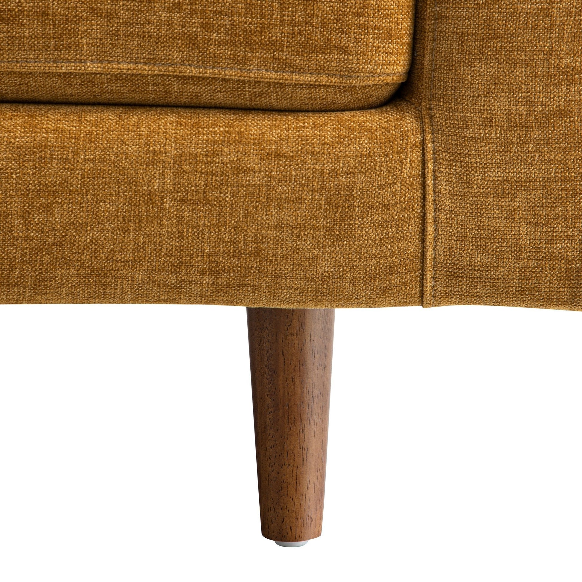 - Upholstered with beautiful spice colour chenille fabric with solid wood legs with walnut colour stained finish for a classic mid-century look.