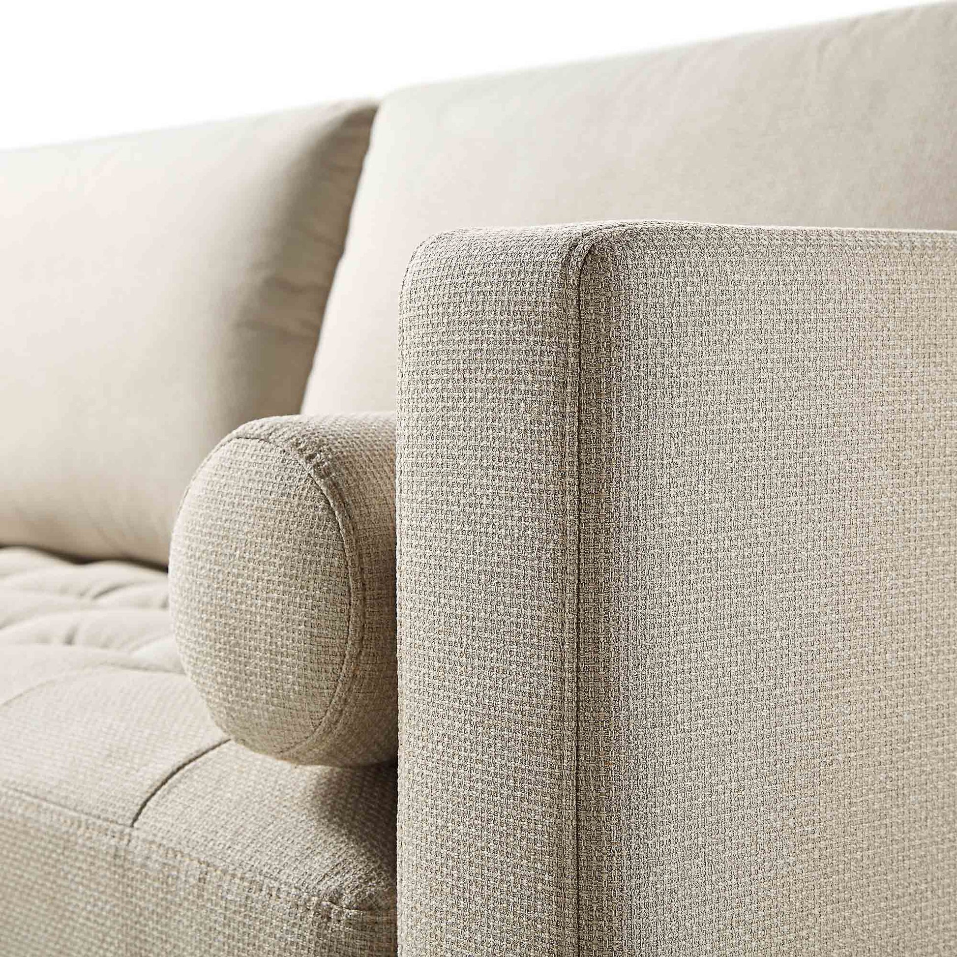 - Upholstered with beautiful beige woven fabric that's easy to style with any decor, matched with solid wood legs with walnut colour stained finish.