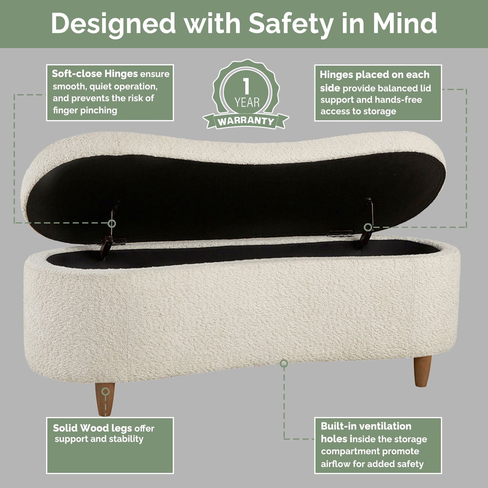 Add cozy texture and stylish function to your space with the Bailey Storage Bench from INK+IVY. Upholstered in soft bouclé-style fabric, this bench features a curved front and straight back so it fits neatly against a wall or bed. A flip-top lid opens to a spacious interior with ventilation holes for airflow and soft-close hinges for added safety. The padded seat offers occasional seating, making it perfect for bedrooms, entryways, or living rooms. Solid wood legs provide sturdy support with a warm, natural finish. Easy to assemble with simple leg attachment. Style and store with Bailey today.