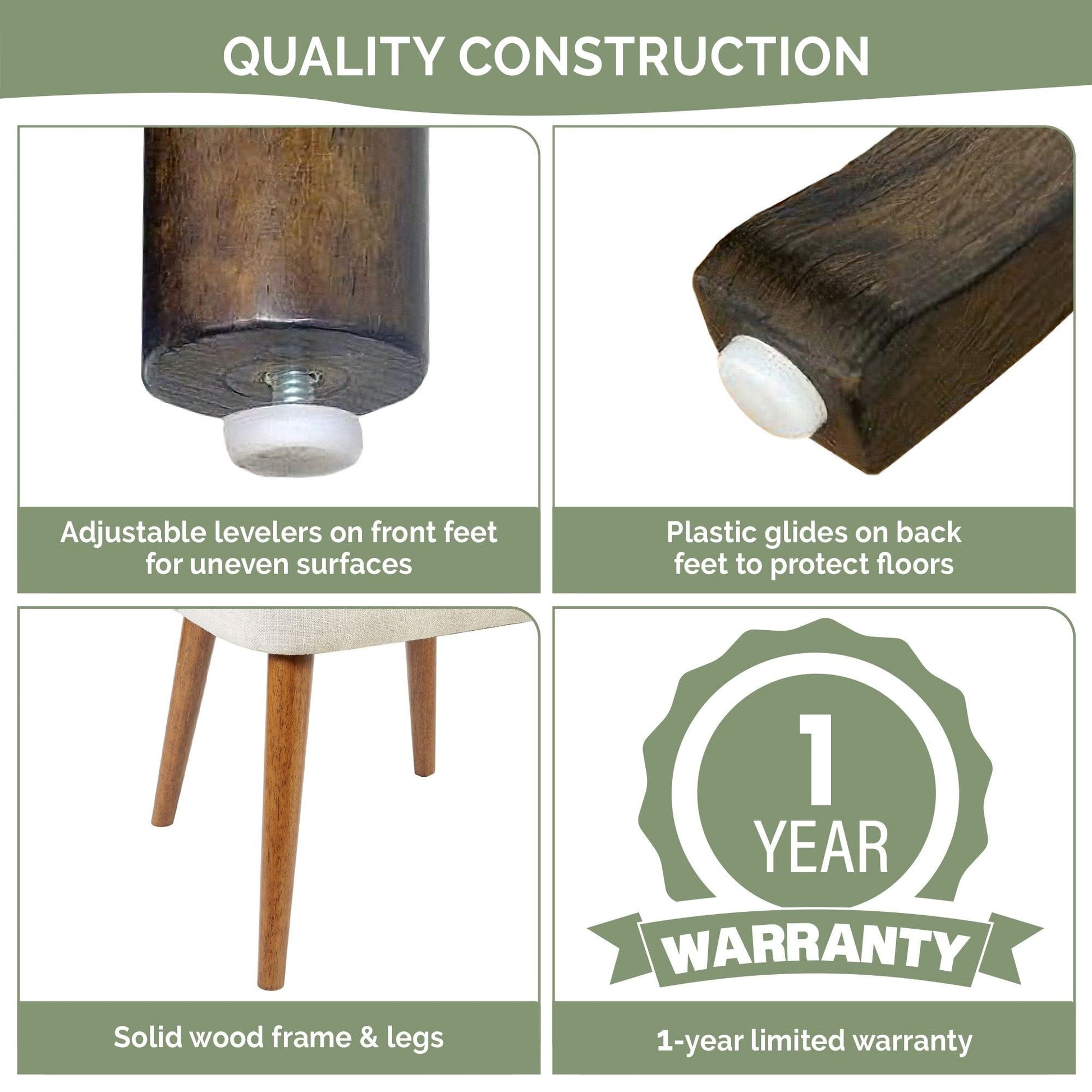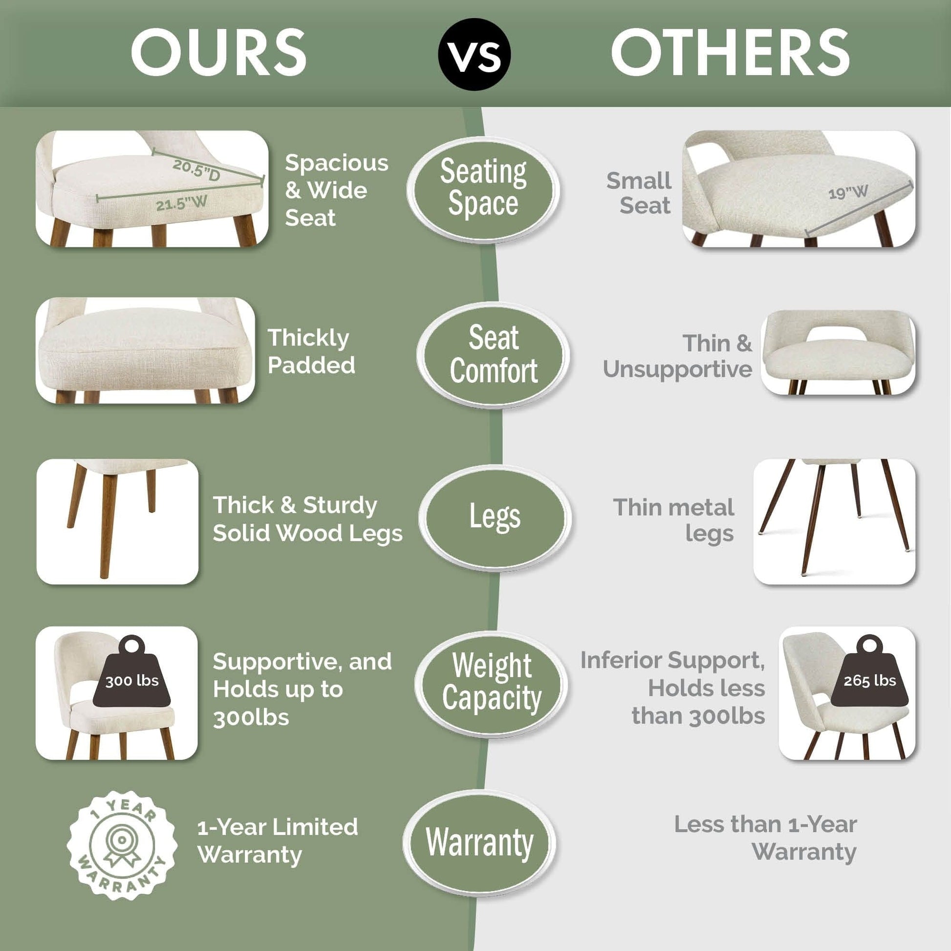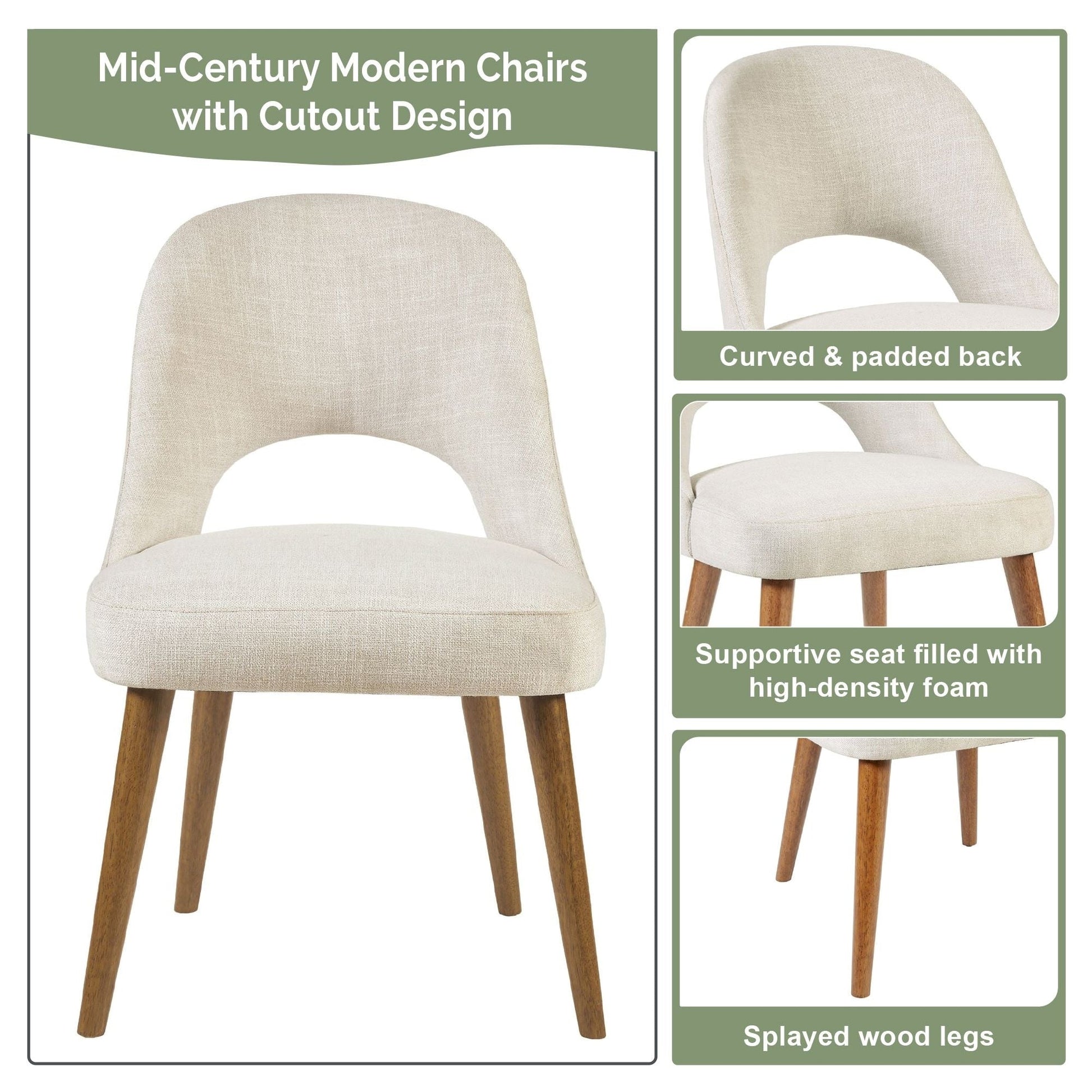 Elevate any space with the INK+IVY Nola Upholstered Dining Side Chairs (set of 2). These versatile, mid-century modern chairs feature a curved cutout back and splayed wood legs for a stylish, space-saving design that tucks neatly under tables. Upholstered in soft, durable, and easy-to-maintain fabric, the thickly padded seat with high-density foam offers exceptional comfort and support for extended seating. Built for durability, each chair supports up to 300 lbs, while the cutout back serves as a convenient handle for easy repositioning. Perfect for dining rooms, living rooms, bedrooms, entryways, home offices and more. Quick and easy leg assembly required for added convenience.