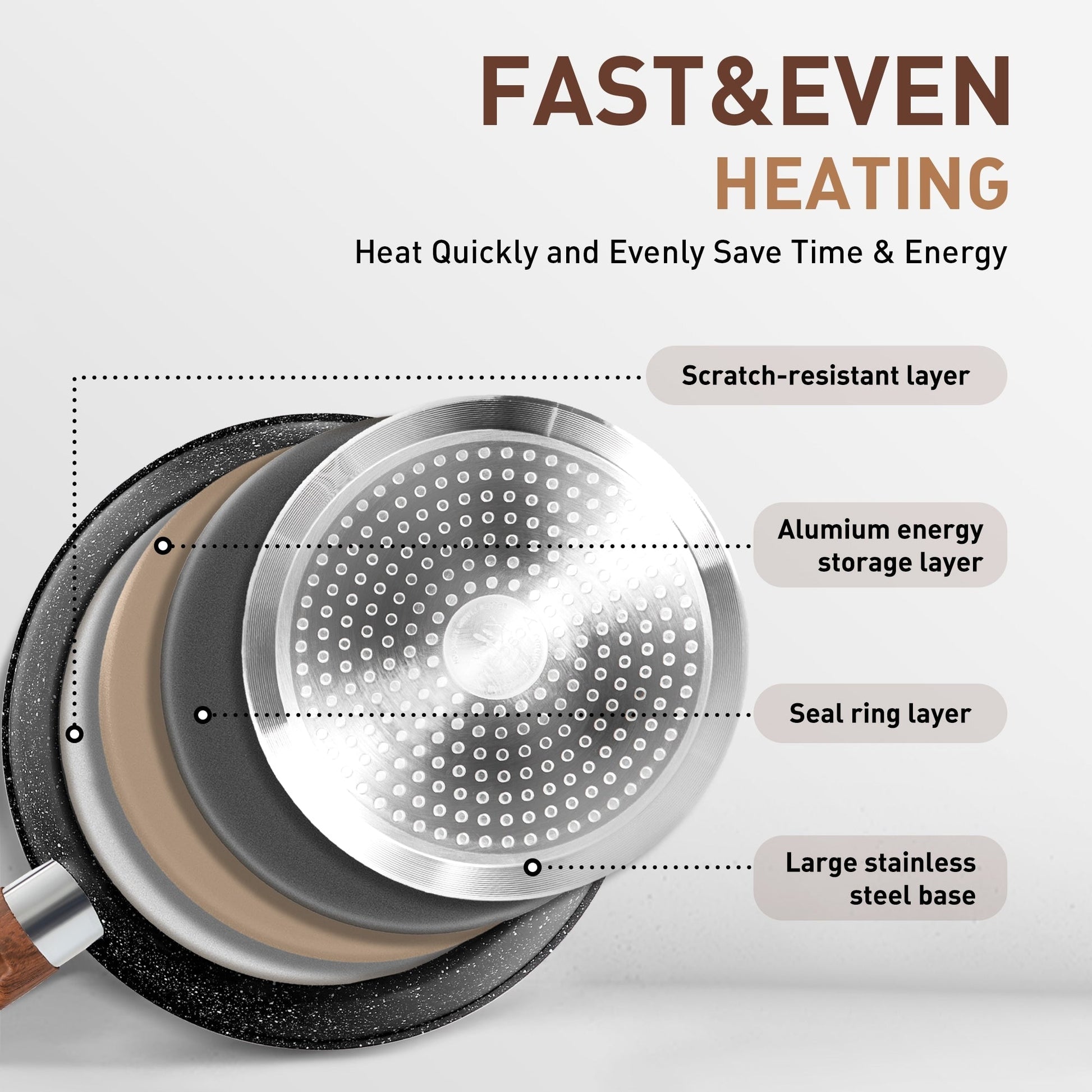 Cook up a storm with Our Nonstick Granite-Coated Cookware Set. Each piece is designed with forged aluminum bottoms for even heating on all stovetops, including induction. The triple food-grade granite exteriors provide exceptional durability and warp resistance, while the natural marble-coated interiors make cooking and cleaning easy. The wood-look bakelite handles add a touch of style to this versatile set.