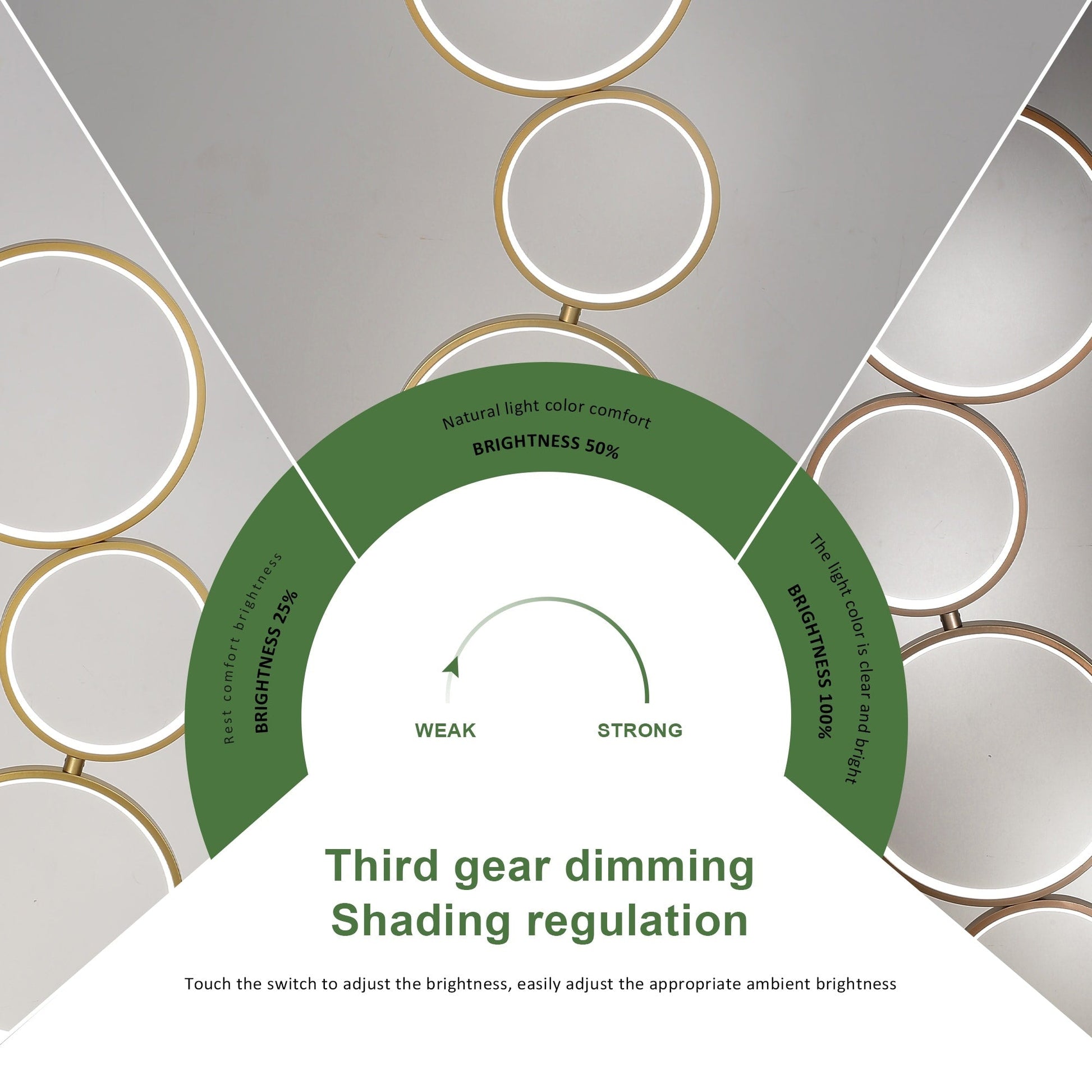 Utilize the 5 rings tall standing lamp in any location to brighten dark corners with daylight white 6,000 K light. It features high brightness of 3260 lumens and a diffused feature to avoid blinding the eyes. Tap the built-in foot switch to dim or brighten the lights. From full strength, one tap dims to 50%, a second to 25%, and a third turns the tall lamp off.