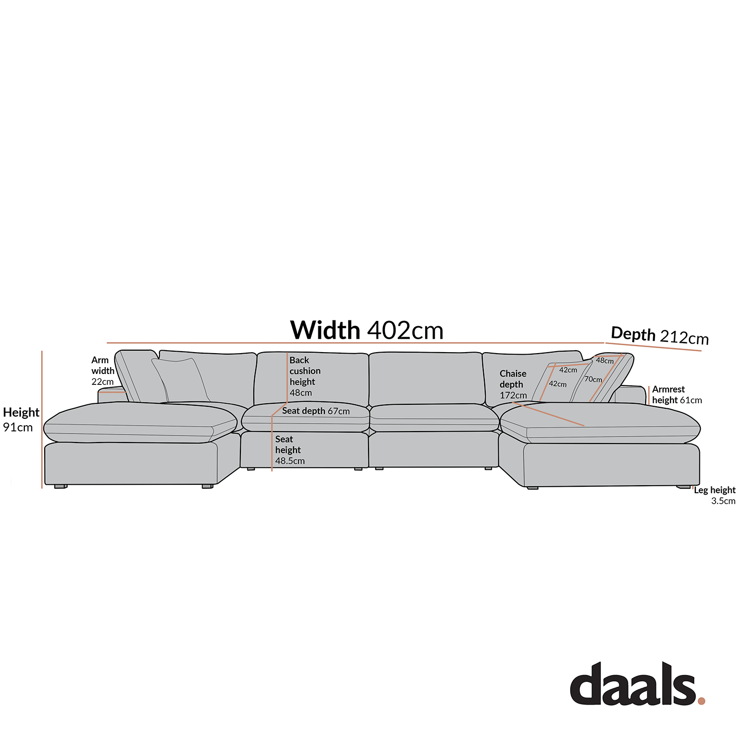- 6-piece chaise modular U-Shape sofa size: W 402 x D 172 x H 91 cm.