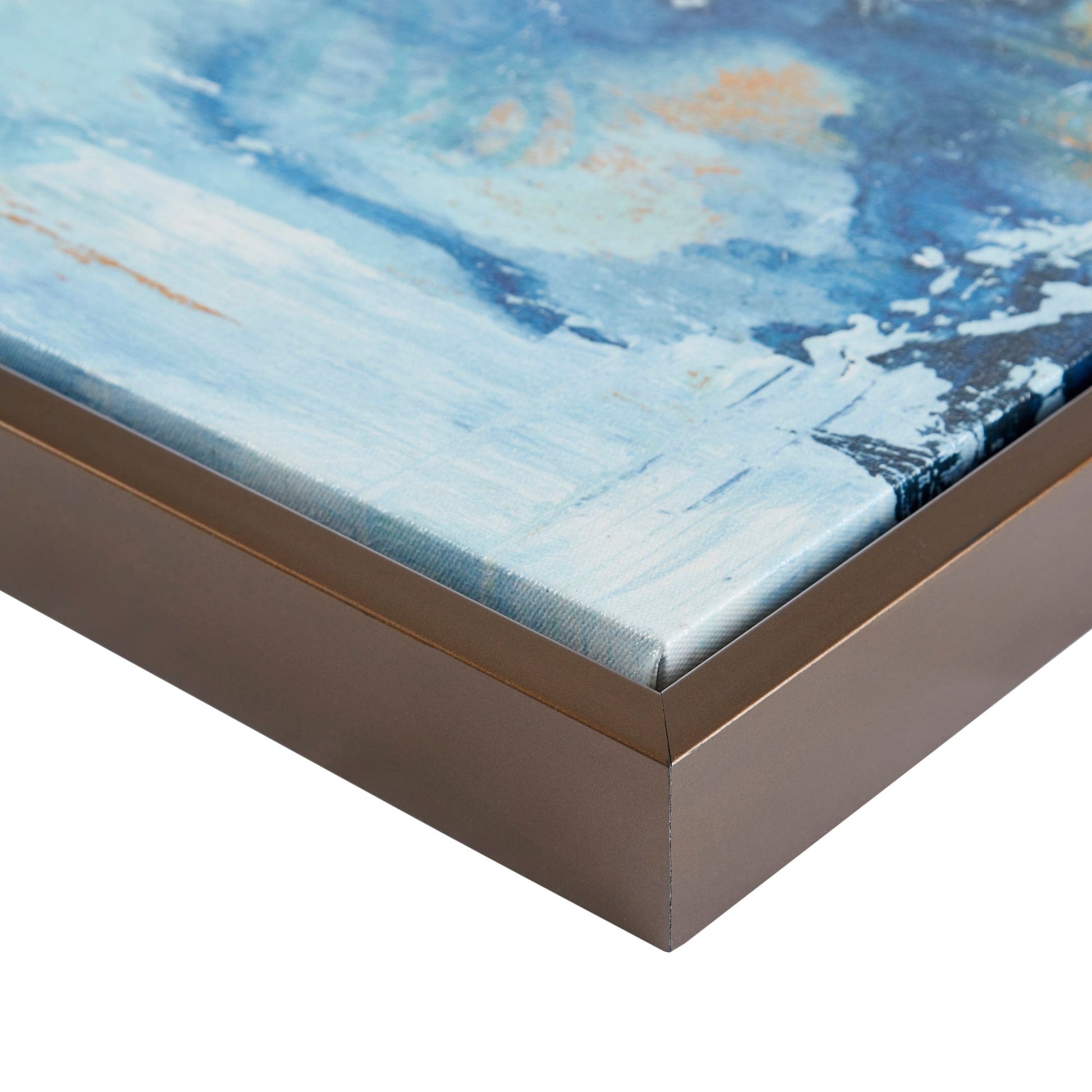 Accent your home decor with the Madison Park Blue Horizon 5-piece Gallery Framed Canvas Wall Art Set by Artists Elise Green, Edith Phelps, and Aubrey. Each canvas wall art features an abstract design in soft blue and natural hues that create a cool and relaxing atmosphere. A gel coating adds a clear sheen to each smooth rolled canvas to protect the colors from fading, while a bronze frame provides an elegant finish. Hang this five piece wall art set together to create a gallery ready look or hang them separately around your home to complement your decor with a modern touch. Each canvas has 2 D-rings on the reverse to easily display anywhere in your space.