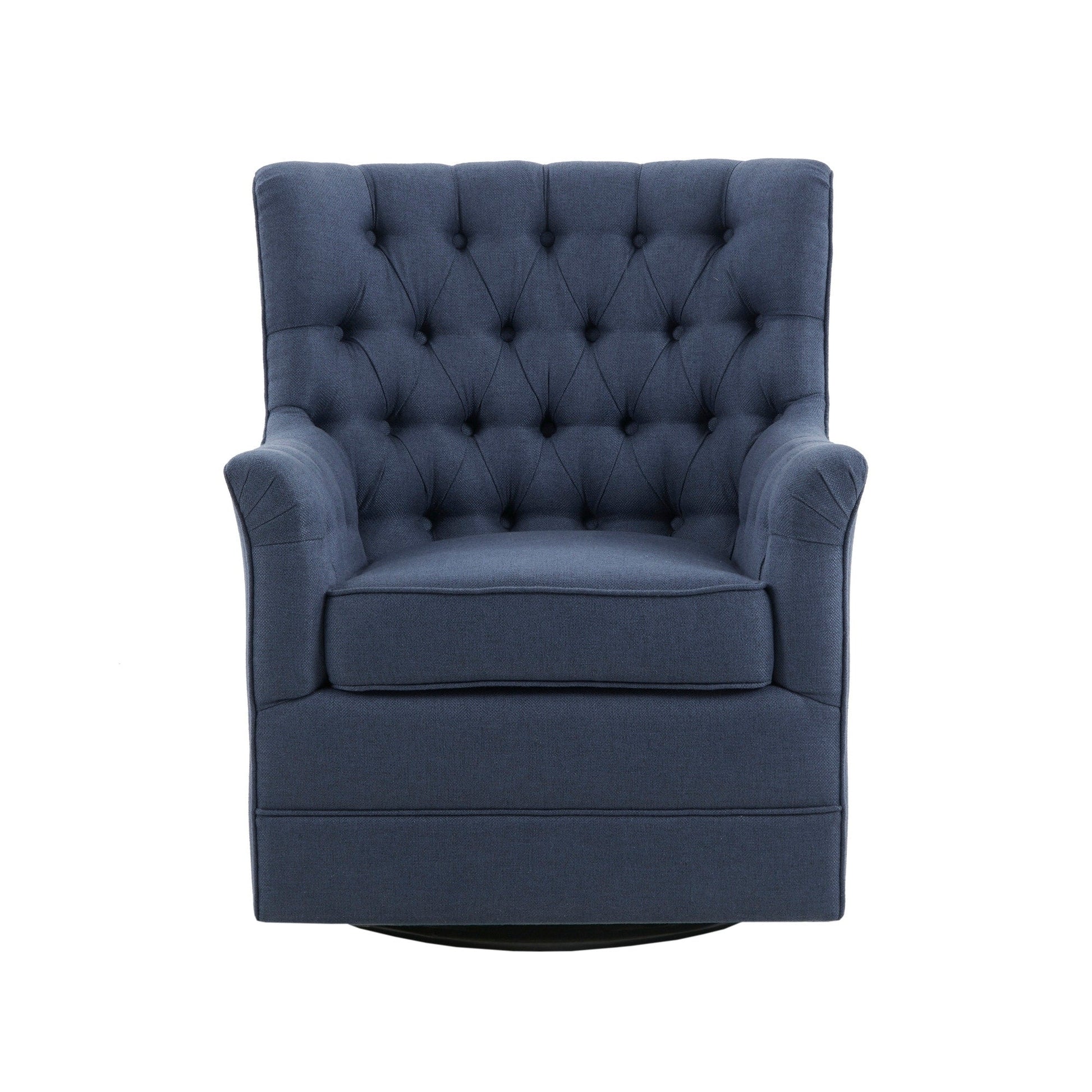 Relax in the comfort and style of the Madison Park Rae swivel glider chair. This swivel chair is upholstered in a soft fabric with a hand-tufted back to create a traditional look. The swivel glide base allows the chair to rotate 360 degrees, while also being able to rock smoothly back and forth. With a comfy removable seat cushion, this swivel glider chair adds a classic comfortable touch to your living room.?