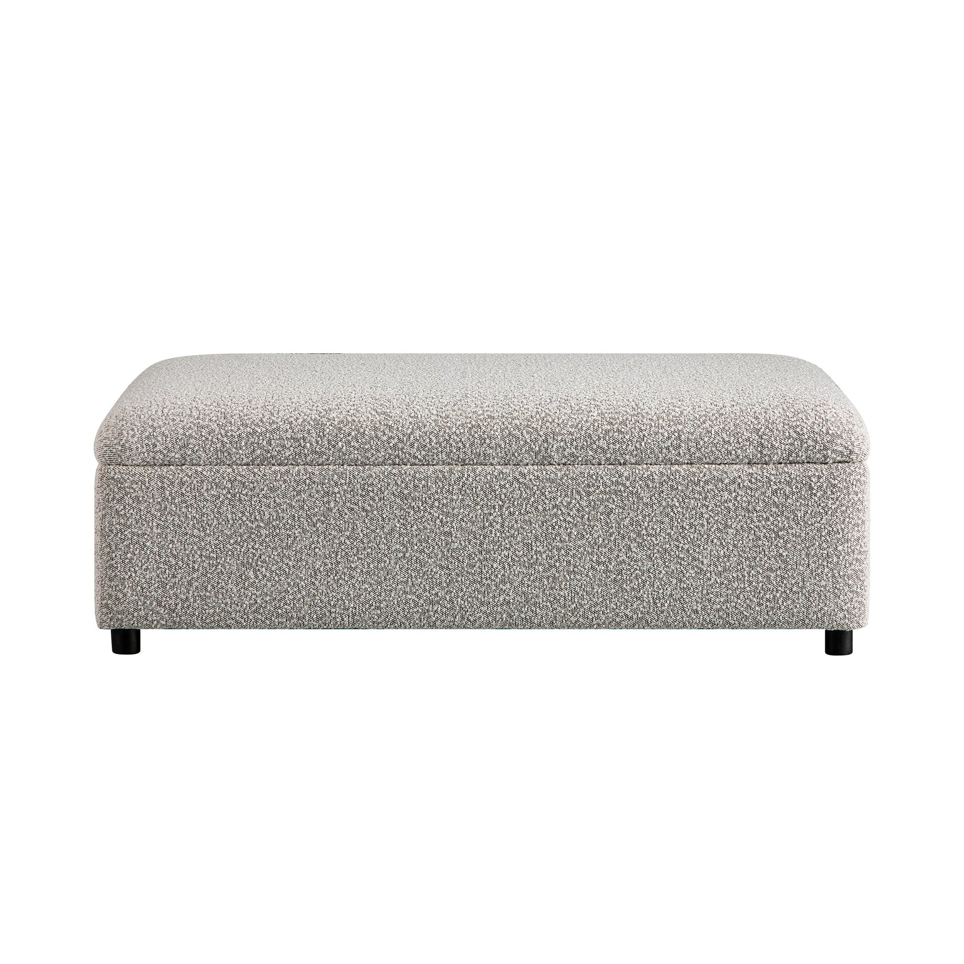 - Designed with ease and elegance in mind, the compact silhouette doubles as a chic ottoman by day, upholstered in a cosy grey boucle fabric that adds texture and warmth to any room.