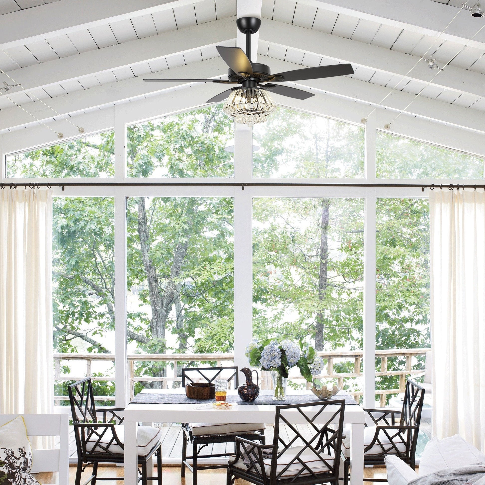 Stay cool with style with the Modern Chrome 52-inch Crystal Chandelier Ceiling Fan with Remote from Parrot Uncle. This cost-efficient yet elegant ceiling fan serves both your cooling and lighting needs, featuring a full glass crystal shade that sparkles and catches the light. The silvertone-stained wood blades move an impressive amount of air, making it the perfect addition to any room. The included handheld remote control makes it easy to operate the 3-speed AC motor and change the speeds, while the timer function allows you to set it for 2, 4, or 8 hours. Perfect for sloped ceilings up to 15 degrees.