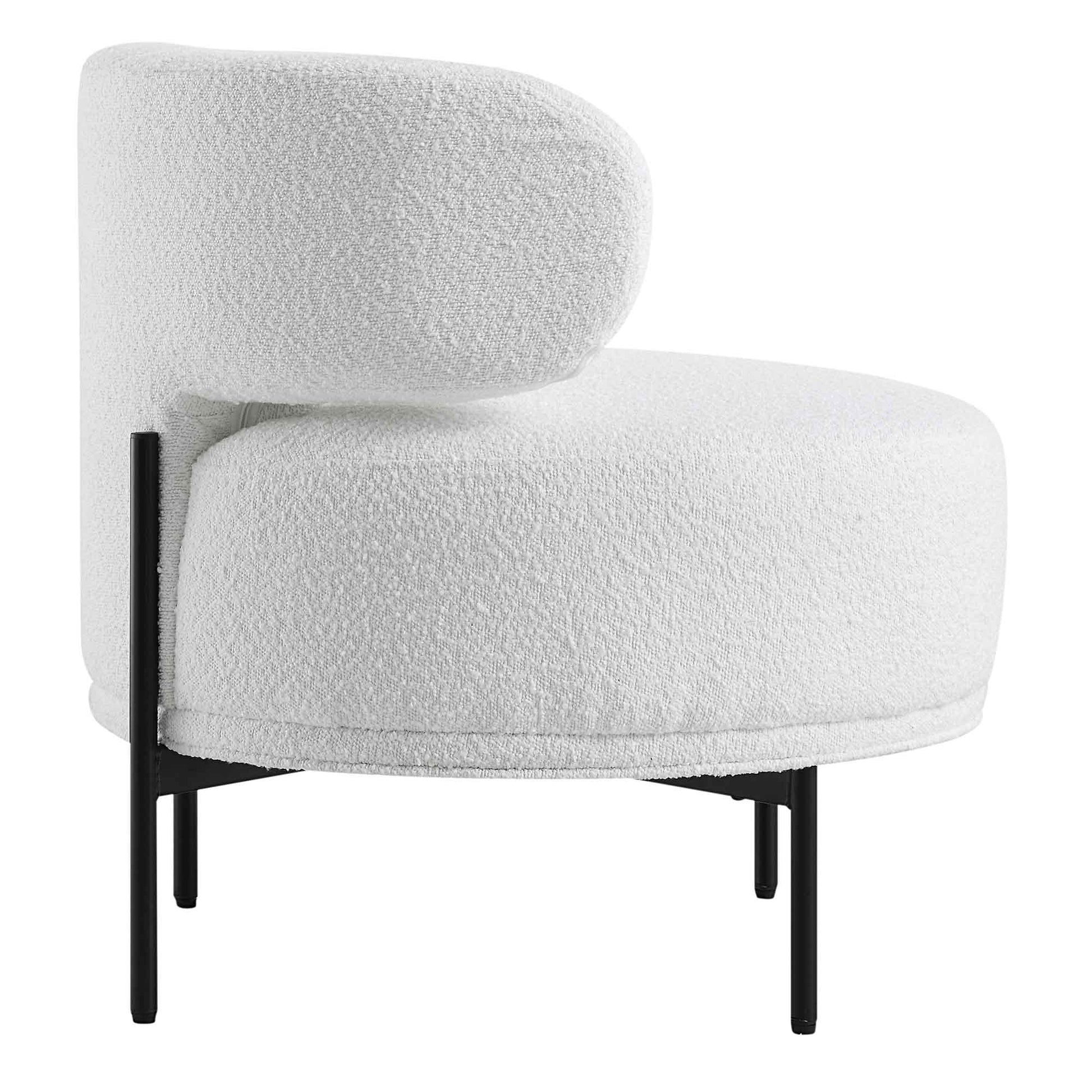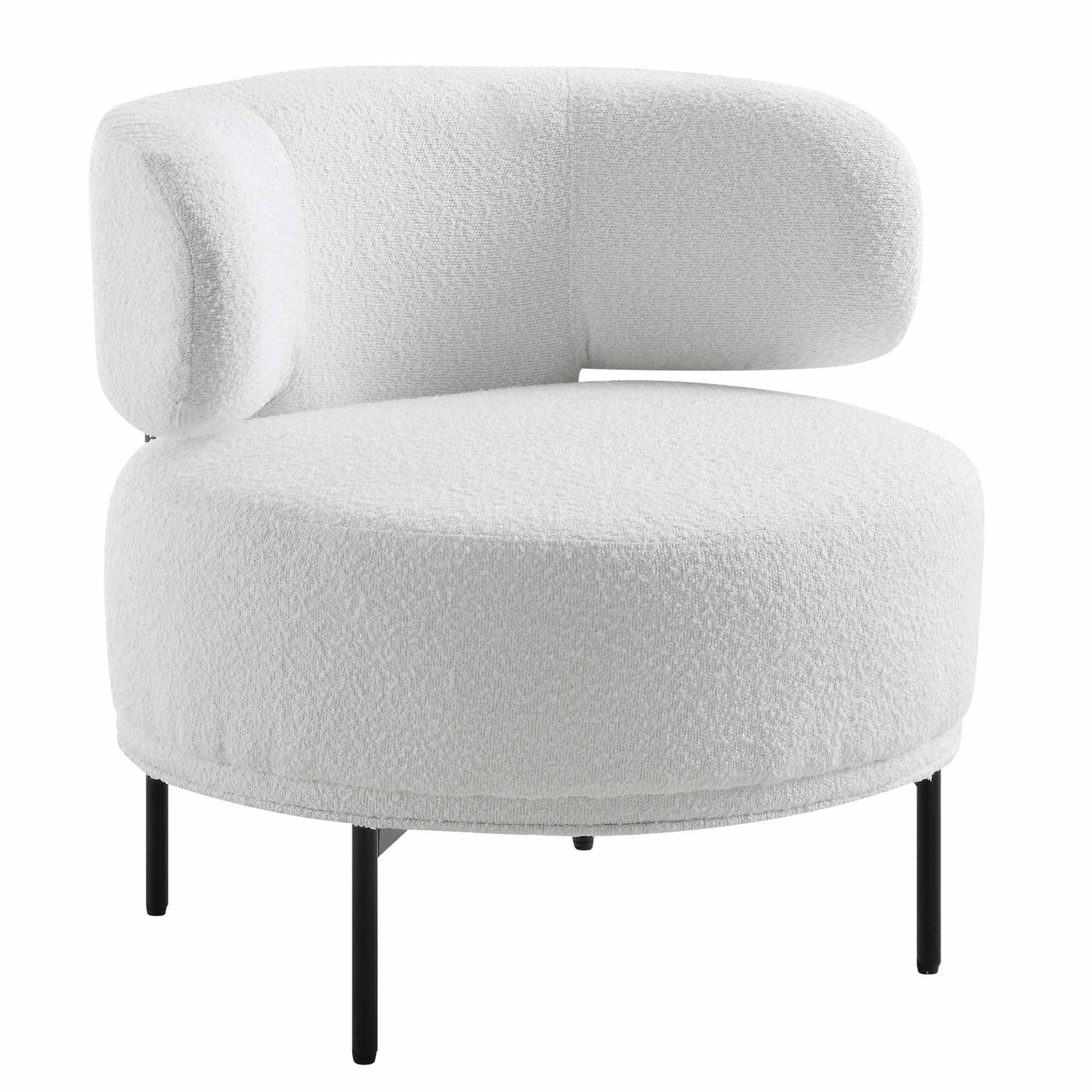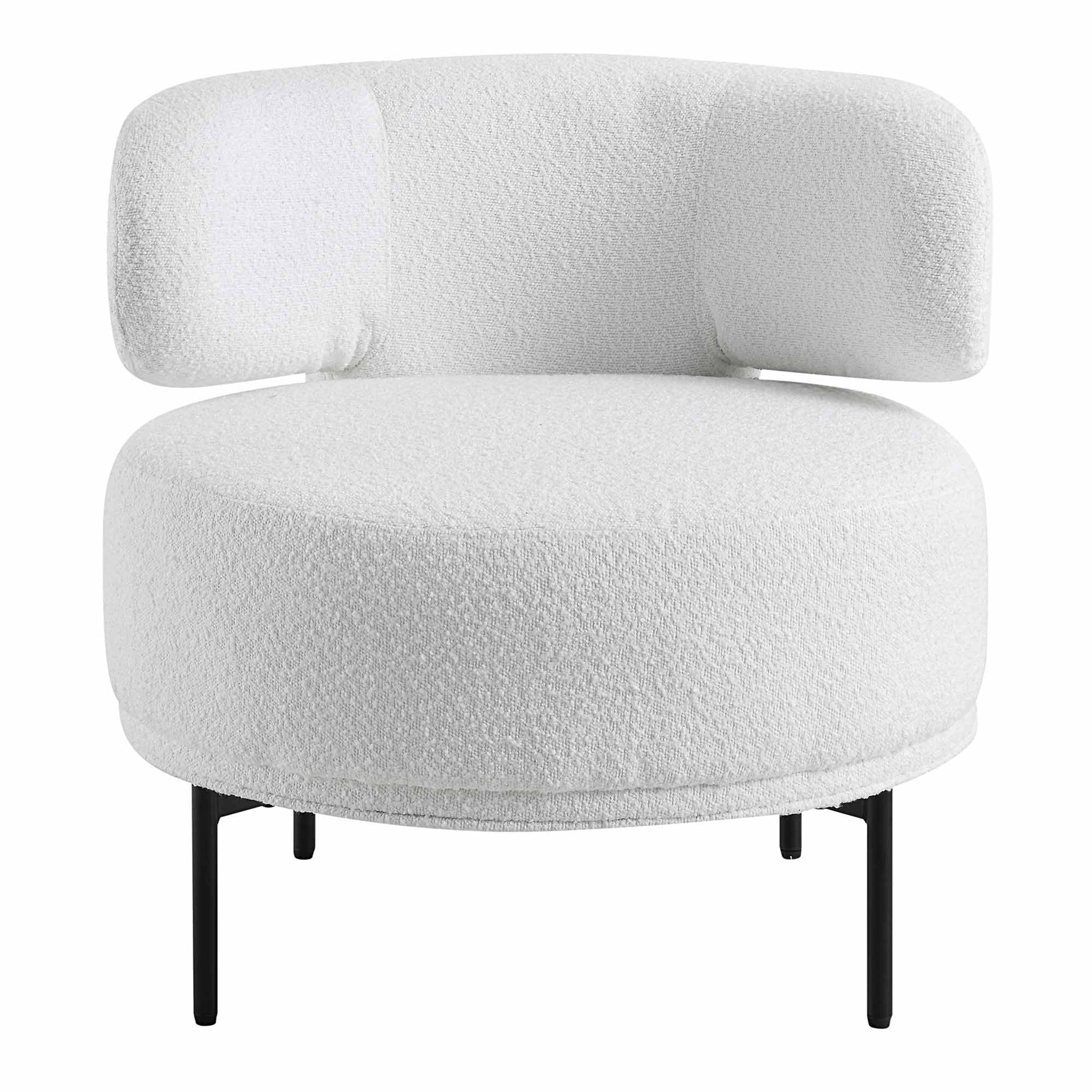 - Chunky seat is well cushioned and upholstered with textured white boucle fabric, paired with slim metal legs finished in matte black for a sophisticated look.