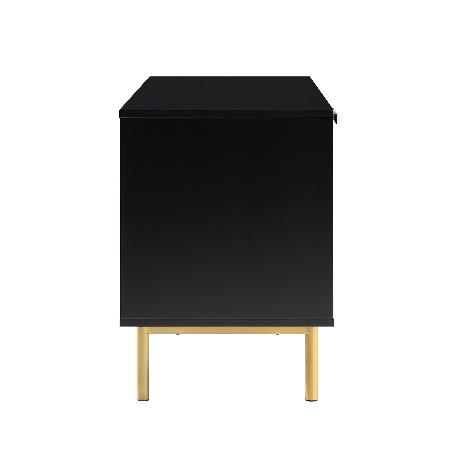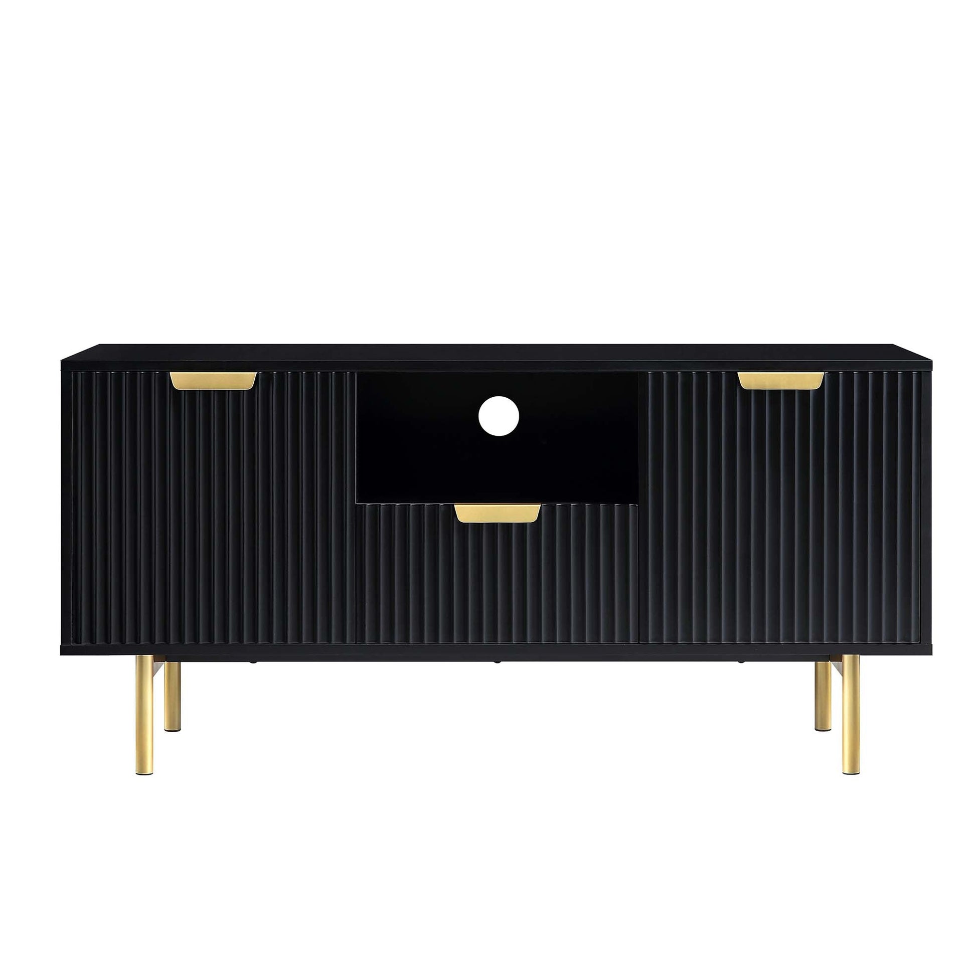 - The 120 cm wide TV unit features ribbed front finished in matte black paint, completed with contrasting gold effect handles and legs.