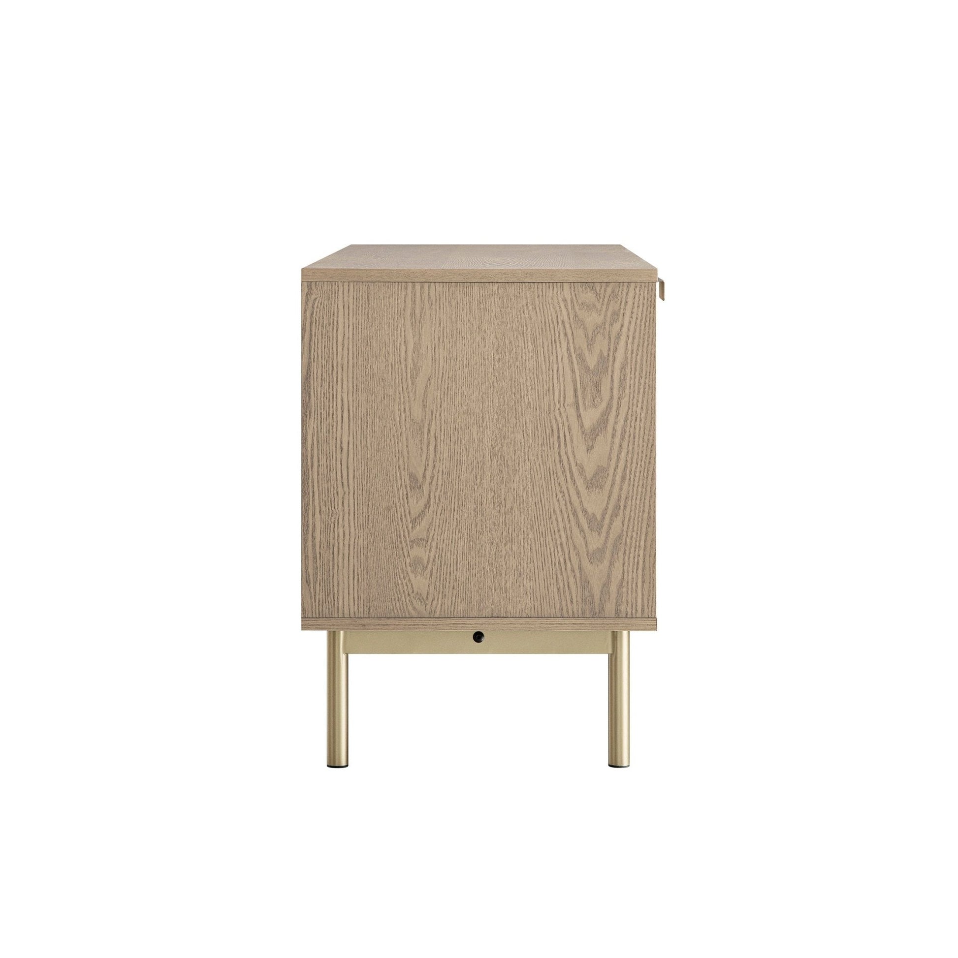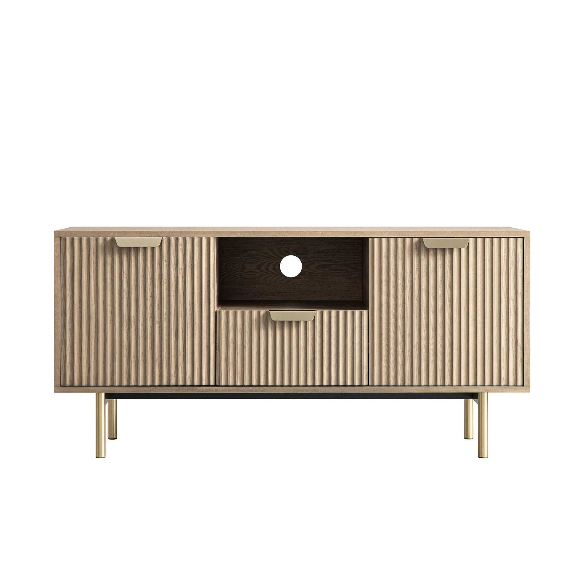 - The 120 cm wide TV unit features ribbed front finished in light stain, completed with contrasting gold effect handles and legs.