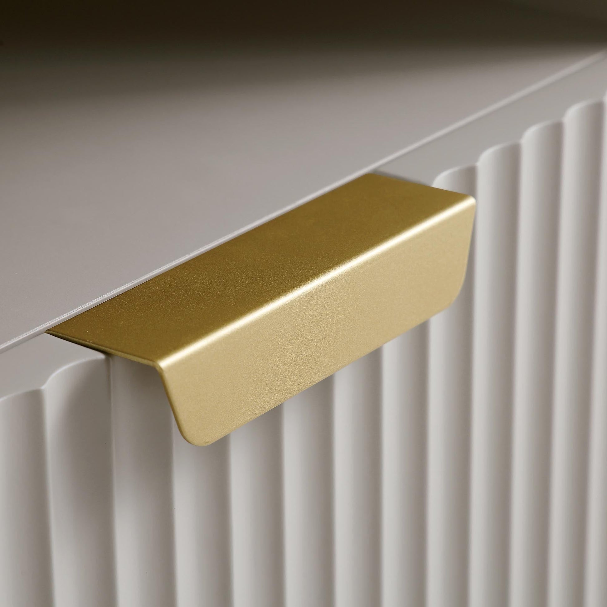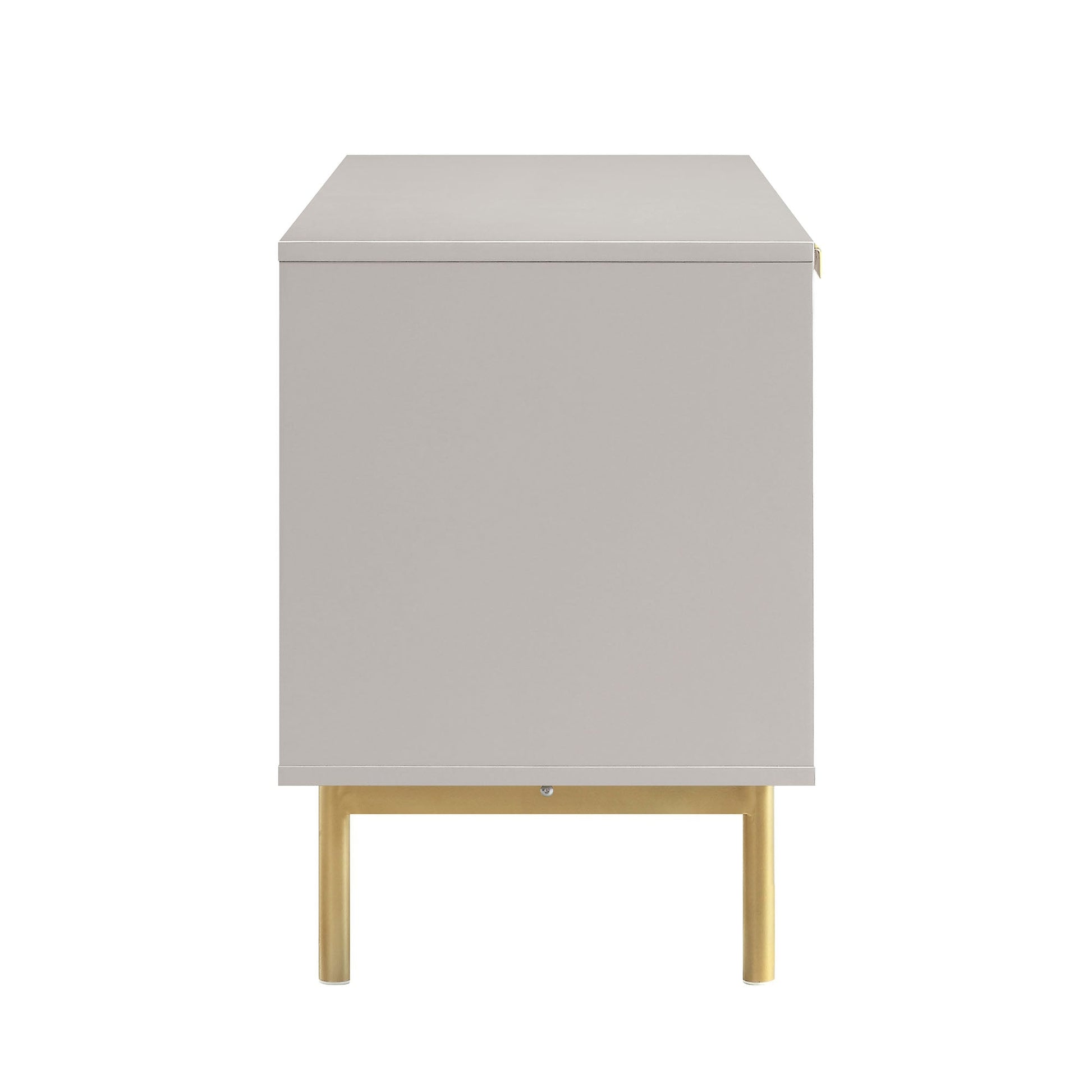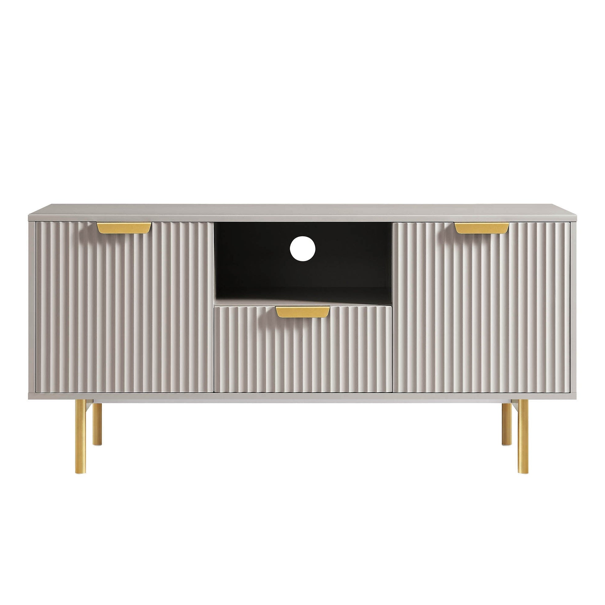 - The 120 cm wide TV unit features ribbed front finished in matte taupe paint, completed with contrasting gold effect handles and legs.