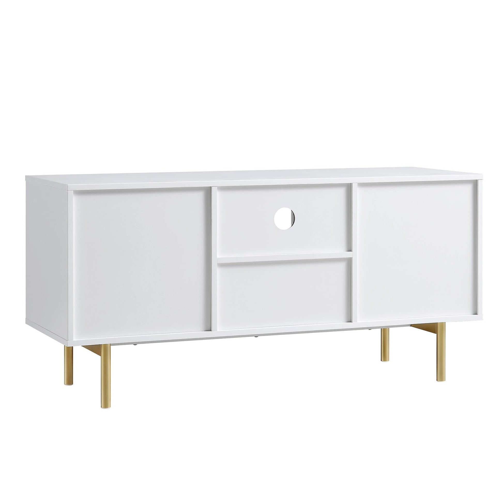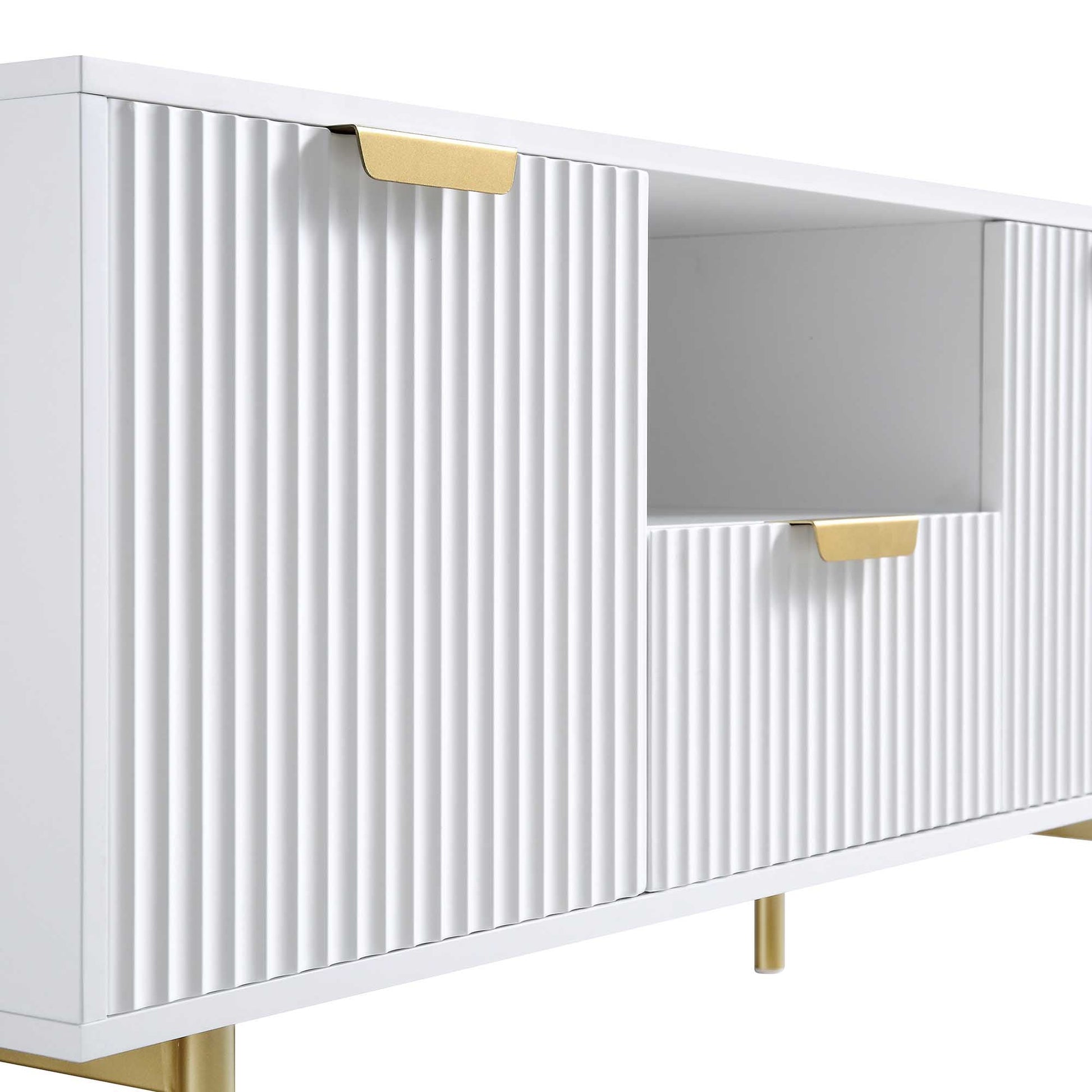 - The 120 cm wide TV unit features ribbed front finished in matte white paint, completed with contrasting gold effect handles and legs.