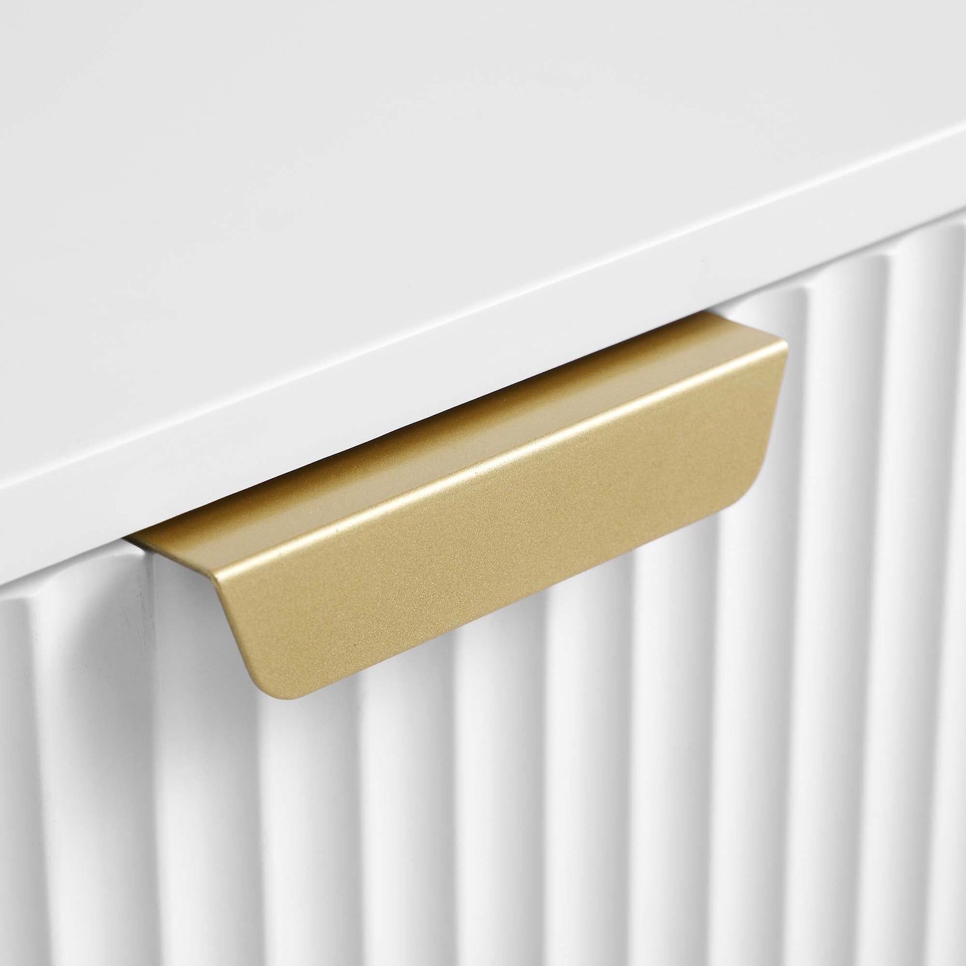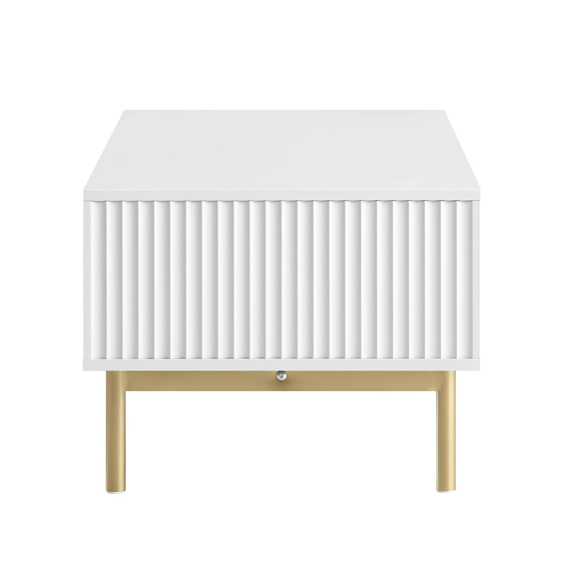 - With a ridged finished in matte white paint, the coffee table is further enhanced by the gold drawer handle and legs.