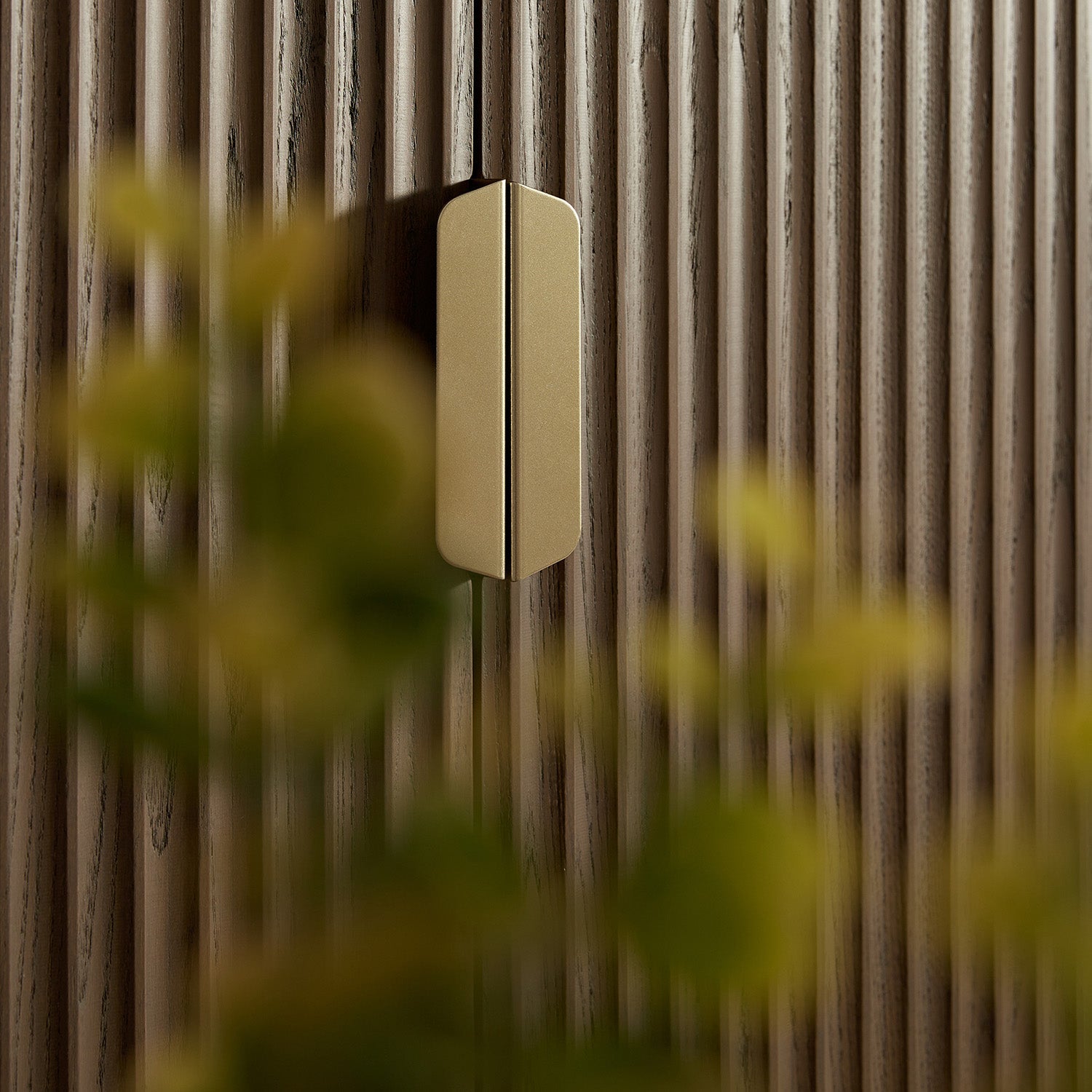 - Its clean-lined frame is paired with a bold ridged door front, while slim, brushed-metal legs add a subtle touch of glamour.