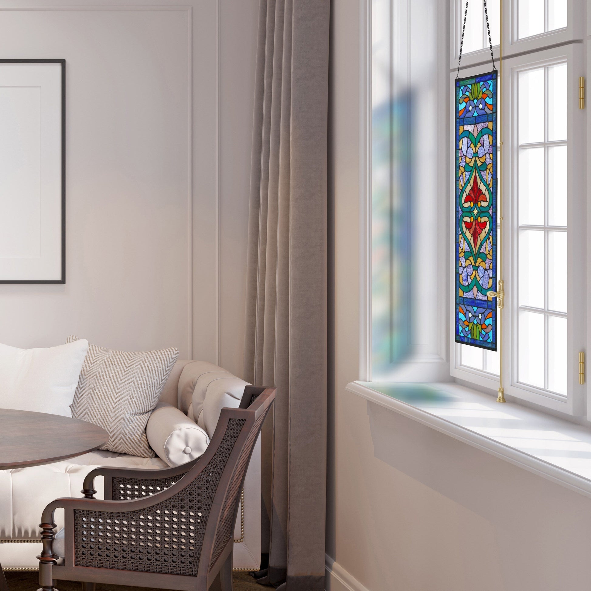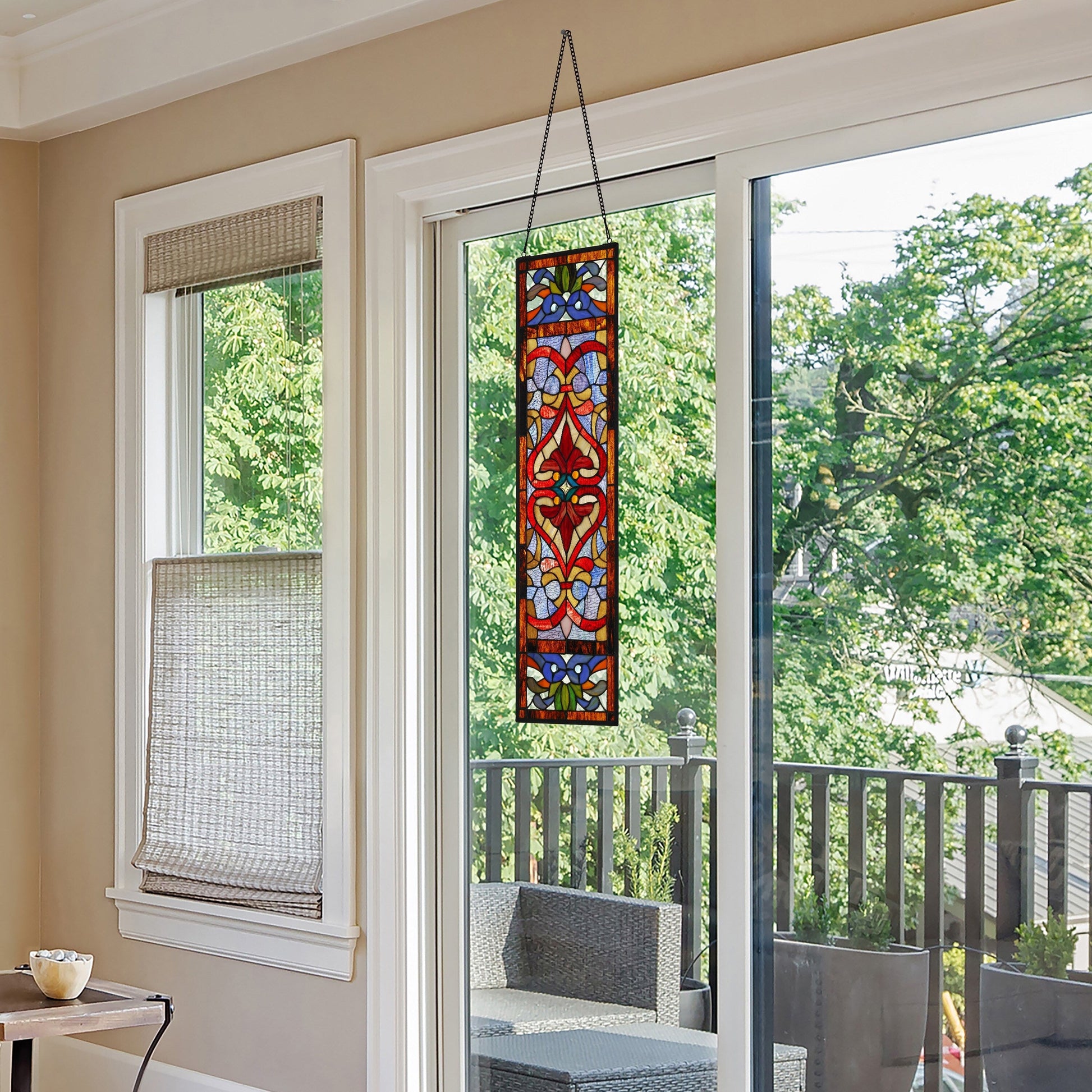 Add privacy and beauty to your home with this Victorian-style stained glass window panel from River of Goods. The exquisite Fleur De Lis design is handcrafted with brilliant blue, teal, and red colors that catch the sun's rays and reflect light throughout any room. This panel comes with a decorative hanging chain for easy installation and can be displayed as a sun catcher, wall hanging, or next to your front door. Delight your loved ones with this stunning glass panel that adds warmth and happiness to any living space.