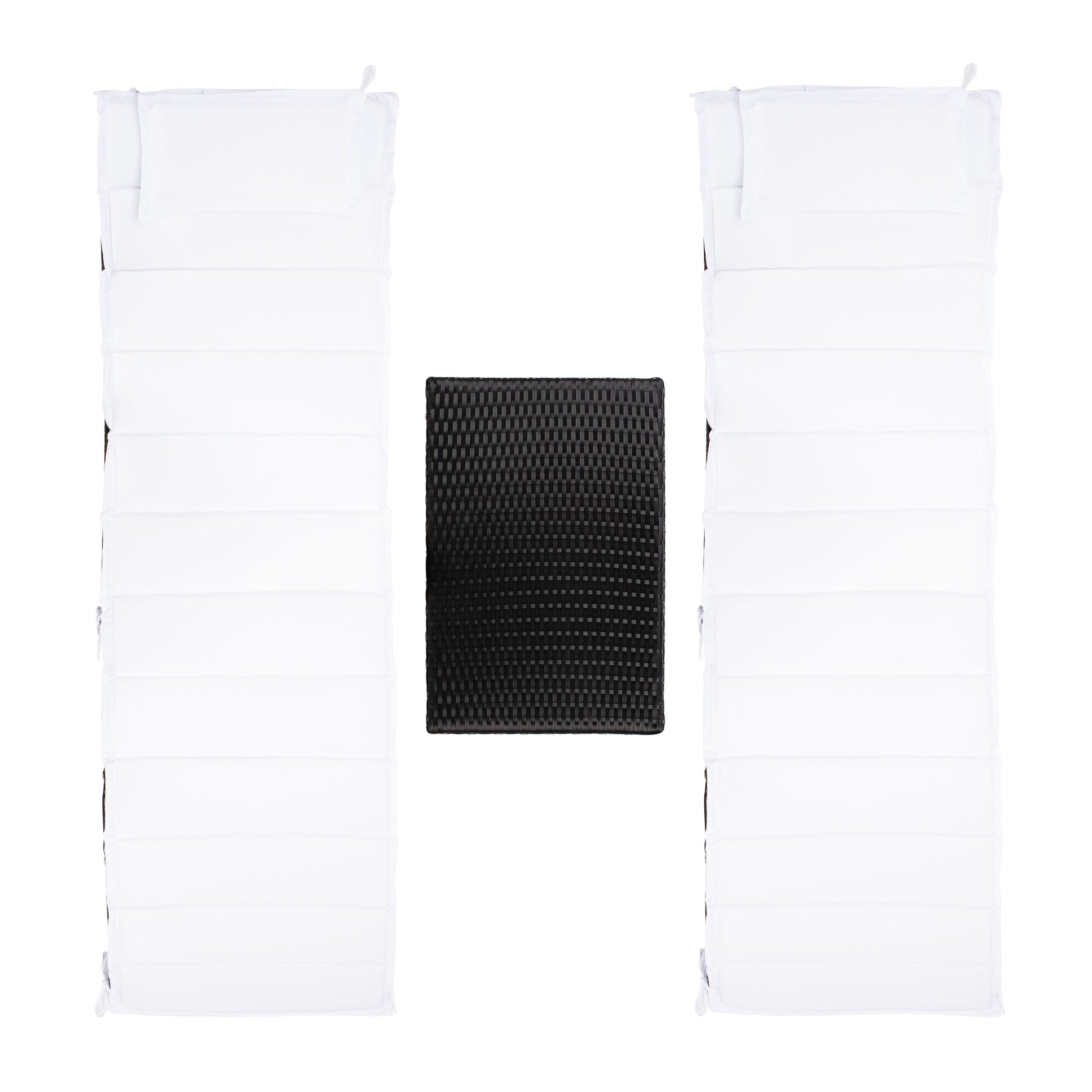 Luxuriate in the summer sun with this 3 Piece Sunlounger Set. The softly flowing elongated silhouettes of Carew's two PE rattan seats are perfectly topped with plush white cushions for maximum relaxation, and a matching end table is ideal for colorful drinks or fresh fruits.