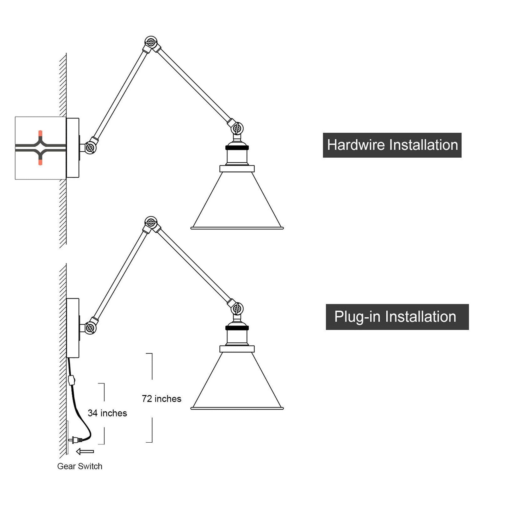Set of 2 Modern Adjustable Swing Arm Lights Plug-in Hardwire Wall Sconces