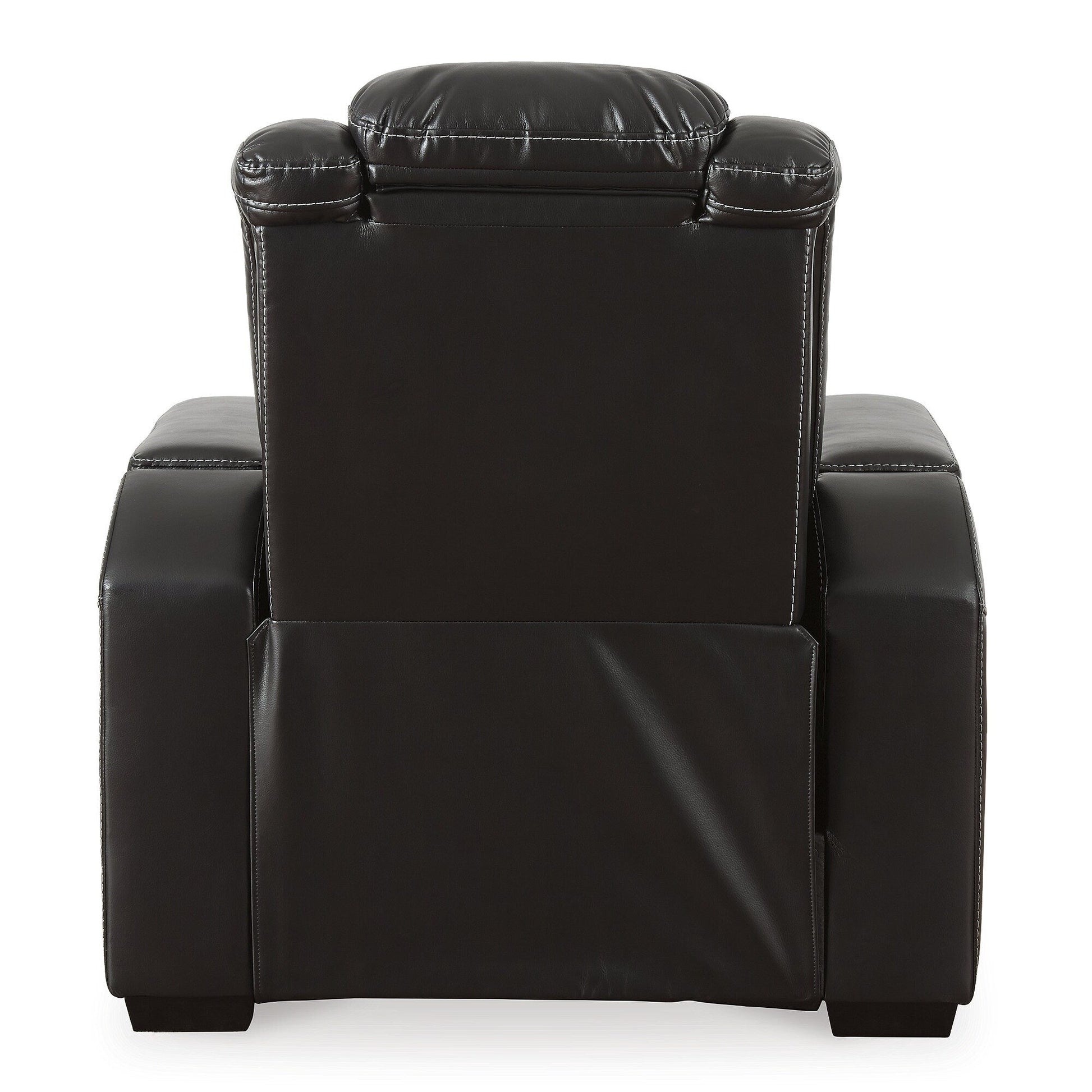 Need a fun, relaxing spot to unwind and watch TV? You'll find that space with the Party Time power recliner with adjustable headrest. In a midnight-colored polyester upholstery with cross hash stitching, lattice accents, and LED lighting, it has a fabulously modern look. When it comes to comfort, you'll love the reclining bucket seat and its adjustable power headrest that delivers a personalized comfortable angle for TV viewing. It's convenient too—sporting lighted cup holders, built-in power button with USB port on control, flip up padded armrest with hidden storage underneath and lower LED lighting. It's certain to become a hit in any home. How could you only get one?