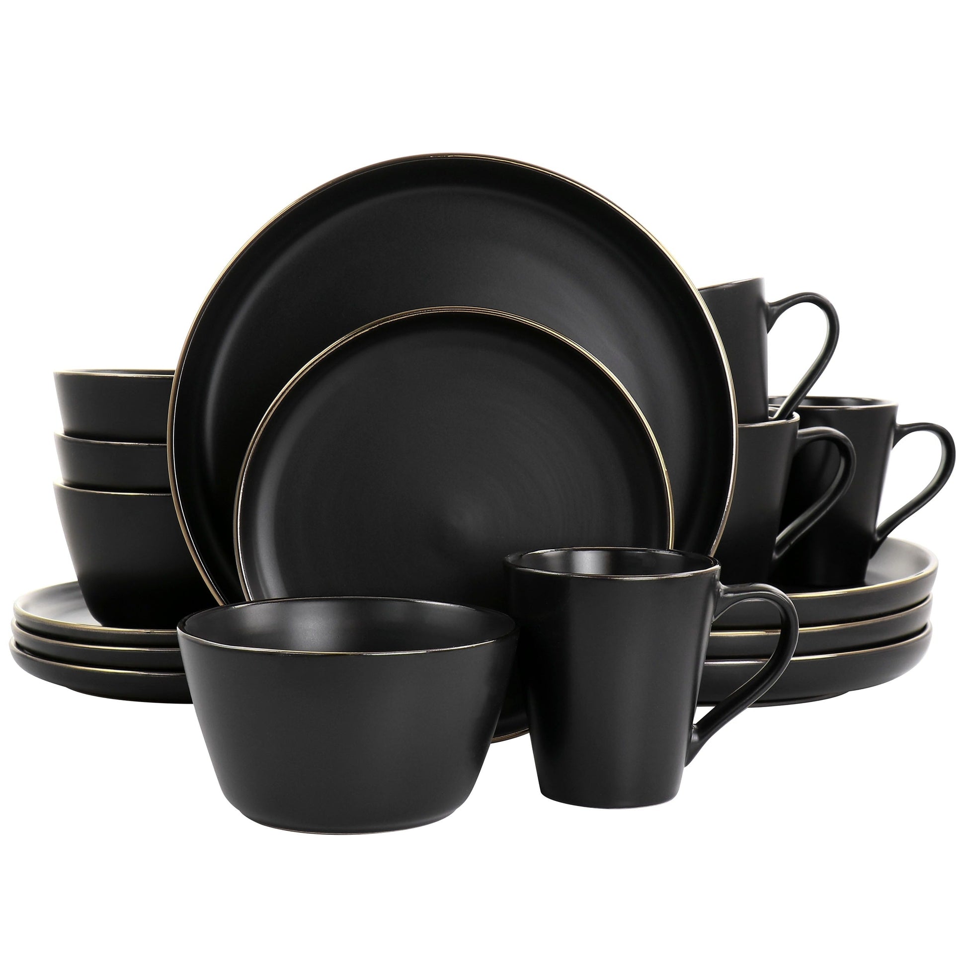 Stoneware Dinnerware 16 Piece Set in Black with Gold Rim